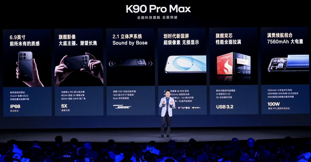 看到K90PM价格后,我沉默了,3999起,香还是拉?简单总结发布会配置 红米 K90 Pro Max, 12+256GB——3999 12+512GB——4499 16+512GB——4799 16+1TB——5299 1️⃣核心: ♢一体冷雕玻纤丨6系航空级铝合金中框 ♢第五代骁龙8至尊版+AI 独显芯片 D2 ♢6.9"120Hz RGB OLED 直屏|LTPS 背板工艺 ♢7560mAh 金沙江电池 + 100W 有线 + 50W 无线 + 22.5W 反充 2️⃣屏幕: ♢2608×1200 分辨率|峰值 3500nits|419ppi 丨华星 M10 发光材料 ♢视觉四等边|龙晶玻璃覆盖|小米青山护眼 3.0 ♢全RGB 无损排列|全亮度 DC 调光|圆偏振光 2.0|1nit 暗光护眼 3️⃣影像: ♢主摄|50Mp 光影猎人 950 1/1.31" F/1.67 |OIS|13.5EV 动态范围 ♢超广|50Mp |120°FOV ♢长焦|50Mp JN5 5X 潜望 |OIS|10 倍无损变焦 4️⃣外放: ♢2.1 立体声系统|双 1115F 全频扬声器 + 2016 双音圈低音扬声器 ♢Sound by BOSE 联合调音|经典 / 均衡双风格调教 ♢金属中框谐振腔|60-200Hz 低频优化 5️⃣外围: ♢0815 X 轴闭环线性马达|红外遥控|全场景 NFC丨IP68&IP69丨双频 GPS + 双频北斗 ♢兼容 PD3.0 PPS 协议|3D 超声波指纹 ♢澎湃 T1 + 芯片|5G-A+Wi-Fi 7|USB 3.2 Gen1 ♢狂暴引擎 5.0|6700mm² 3D 冰封循环冷泵 说实话,国补开始后,厂商定价是真的高,今年子品牌iQOO,真我纷纷上探4千元。K90 ProMax实际也是上探4K了,所以真有点闹麻了。并且各家存储版本涨的也比较厉害,只能说不急的等双11的券和国补吧 当然了,大环境价格如此下,红米K90PM的配置,配上价格,加上部分地区可用国补-500,其实还算香。因为它跟小米17真的就是差个徕卡联名,还有尺寸更大,另外潜望长焦5×光学变焦,也确实比小米17标准版强。 再有就是跟其他友商4K档旗舰机比,主摄1/1.31大底尺寸是不争的事实,USB3.2Gen1也是如此。最可怕的是K90 ProMax的外放,联名BOSE调音后,这个三扬声器音质太强了,陈奕迅都说低音还原很好,保留了录音室的那种细节。 另外还有7560mAh大电池+100W有线+50W无线,以及100WPPS。好像跟友商4K的旗舰机放一块儿也算能打?大家觉得如何?会选择双11入手吗?