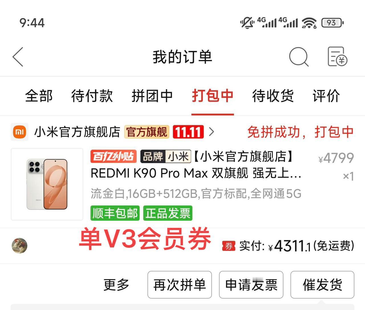 拼多多国补+V3会员,红米K90系列香麻了!K90只用1988起,而K90ProMax则3217起 好消息:店铺就是官方旗舰店了,单用V3会员券的话,是打九折,然后部分地区可以叠加国补,再打8.5折。也就是图1中显示K90仅1988就能到手。 坏消息:另外问了下店铺的人,如果用V3的券的话,K90实物赠品会砍,而K90ProMax则不会砍。 也就是说恰巧你的地区能国补,而且账号可以开通68的V3会员的话,你买K90 ProMax价格是3217元,而K90的价格是1988[吃瓜群众]