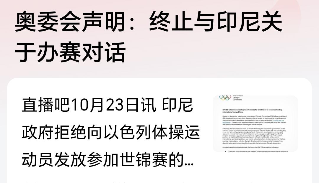 现在我就想看看谁还在说体育与政治无关?去年国际奥委会禁止俄罗斯、白俄罗斯运动员参赛。现在印尼以同样的理由禁止以色列运动员参赛,国际奥委会却不开心了,以后不和印尼合作了。 为什么连国际奥委会都这样双标呢? 其实国际奥委会的本质就是政治,只不过包装得很好的工具而已。 那么它是谁的工具呢? 点右上角关注我,我们一起去看这个魔幻的世界