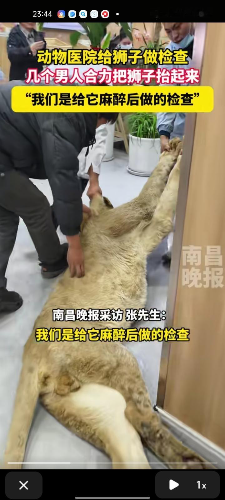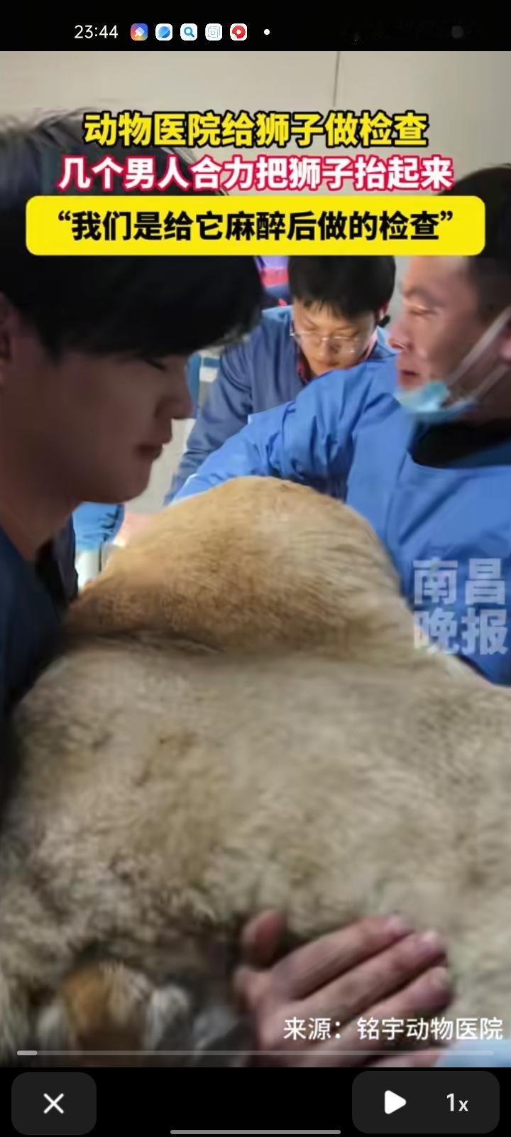 10月19日,河北石家庄。网友发视频称,动物医院给狮子做检查,狮子有200斤左右,患有肠梗阻,六七人合力把狮子抬起来去做检查,CT、血检都在麻醉后做。