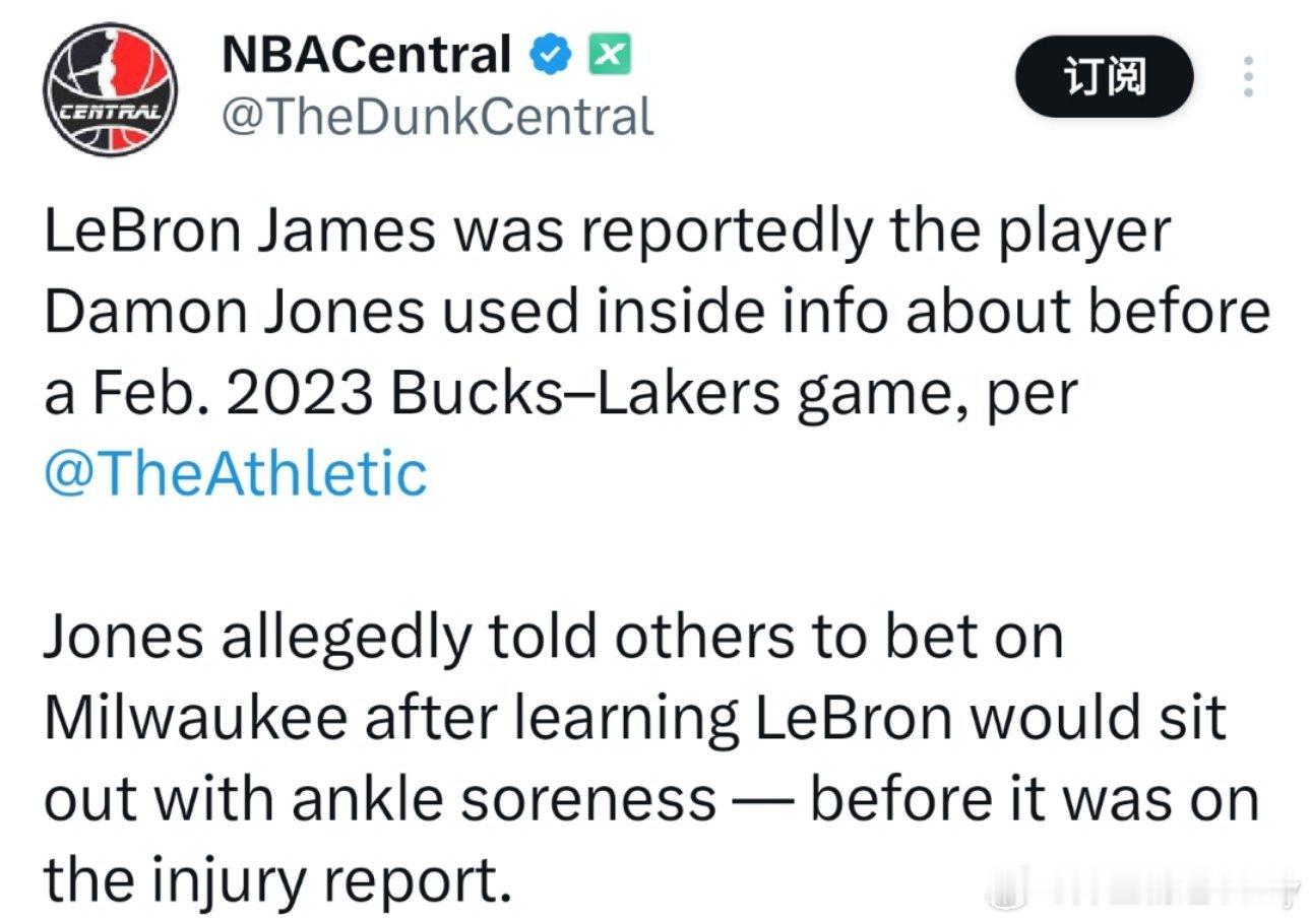 据The Athletic消息,达蒙·琼斯曾利用詹姆斯的内幕消息让他人下注。