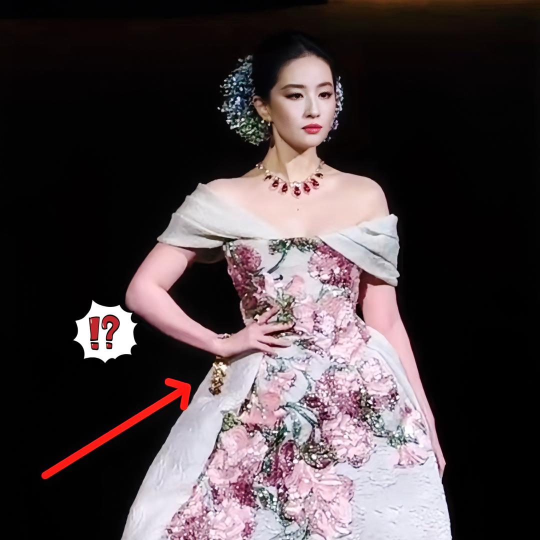 果然不出意外的话,意外就发生了, 刘亦菲的手链滑了, 不是故意炒作,也不是设计效果,没想到的是,在万众瞩目的VOGUE红毯上松了扣。 刚才还盯着她礼服看的观众突然紧张了,她倒跟没事人似的接着走,脚步一点儿也没乱, 本来刘亦菲压轴出场就倍受关注,这种小意外也最容易出糗, 她倒好,面不改色走完秀,助理也及时接上手链,整场下来连个小波折都没留。 唯一慌神的估计是珠宝商吧,这个节骨眼儿上出差错,对接活动的工作人员怕是要写检查了吧,哈哈!