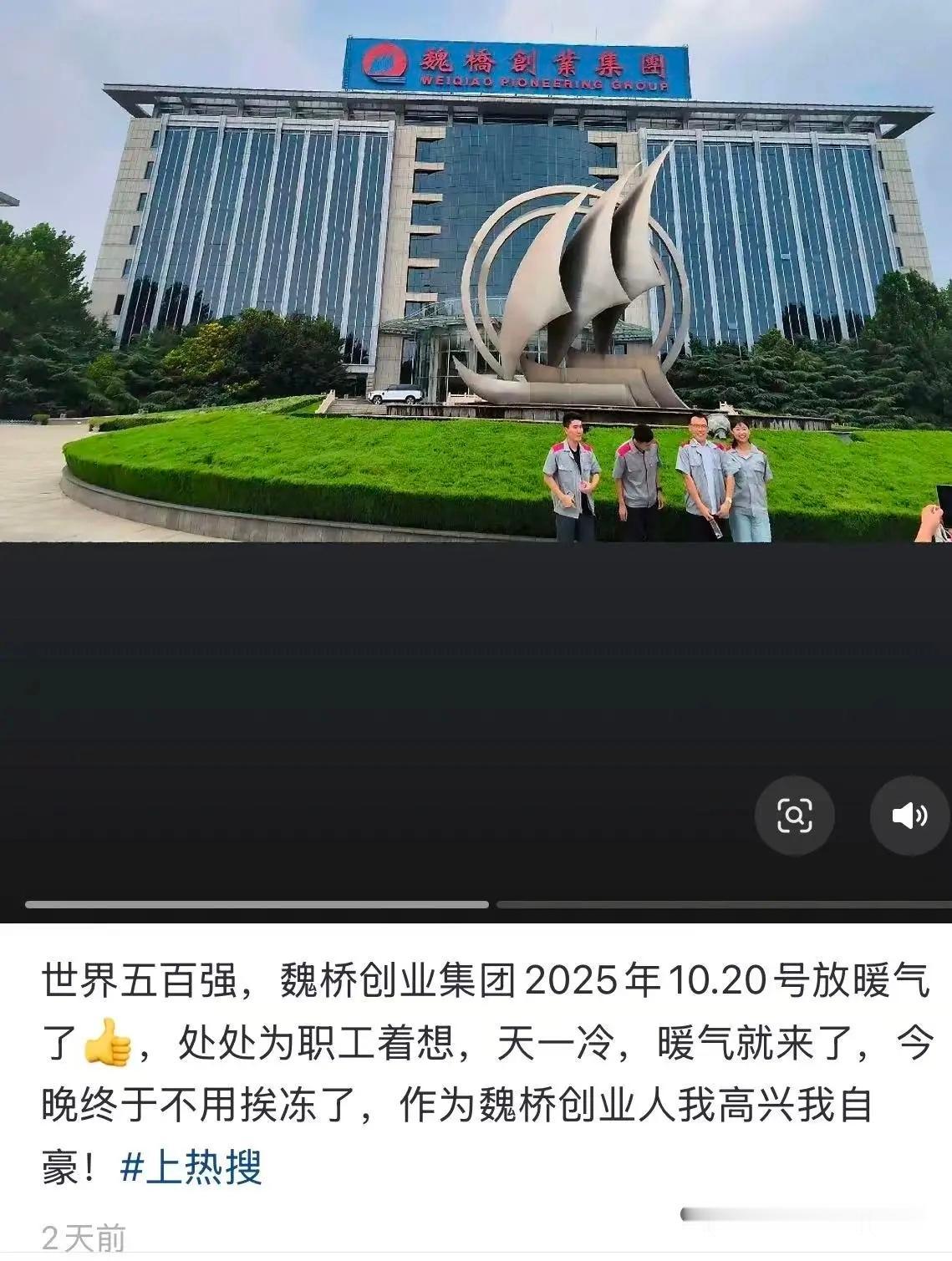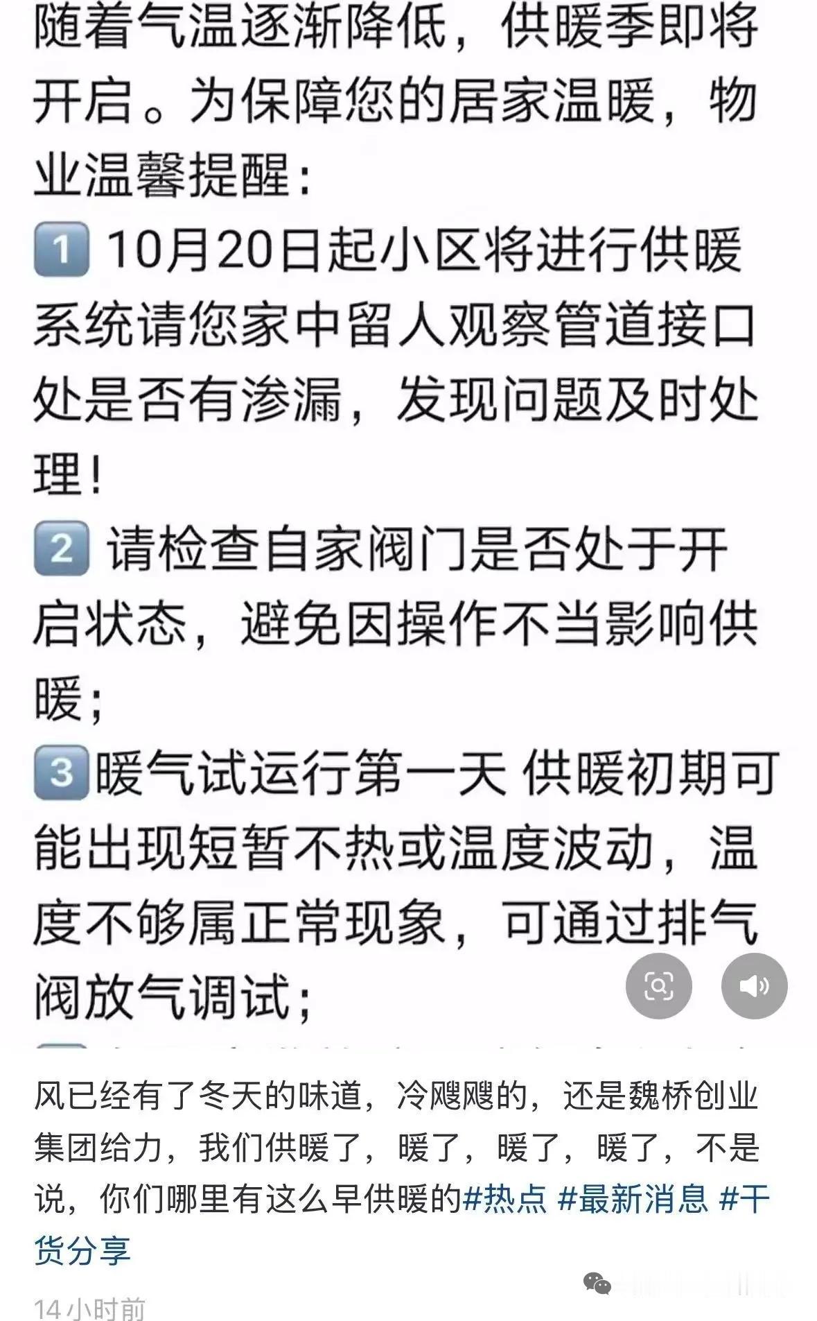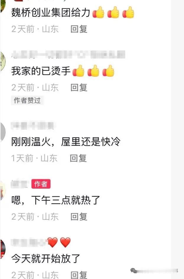 滨州这里供暖了 网友供稿:今天,包括山东滨州在内的北方多个城市冷天气来得比往年早一些,让人们提前感受到了冬天的到来。冷天气下,人们最盼望的就是暖气。 从10月20日起,魏桥创业集团的多个生活区开始供暖,这里已经提前享受到了有暖气的生活。