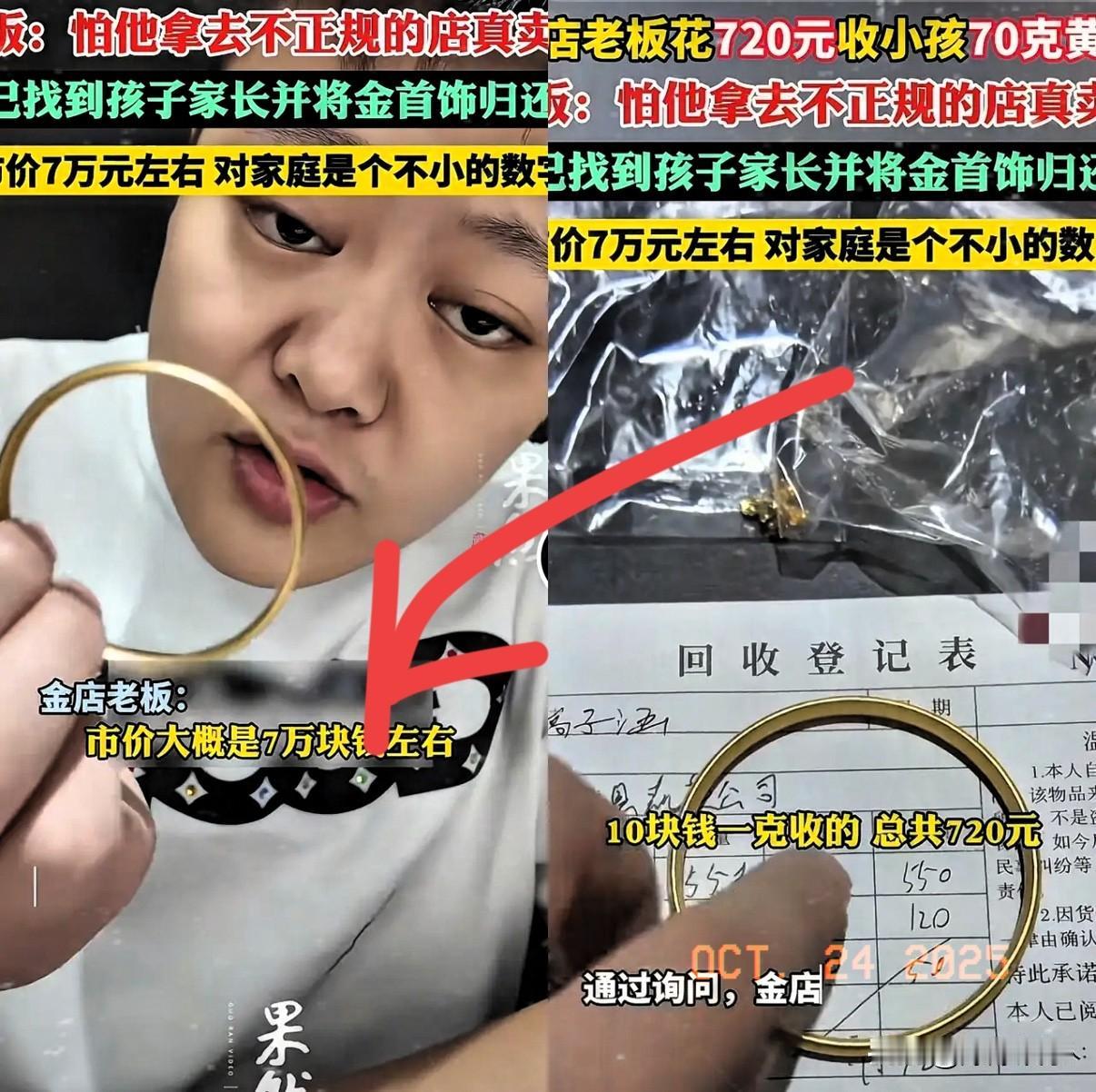 金店老板这波操作, 活该他生意火! 四川雅安有个小孩拿着70克黄金去金店卖,老板一看就觉得不对劲——现在黄金价格这么高,70克值好几万,一个小孩哪来这么多黄金?老板没直接戳穿,先以720元收下黄金,转头就赶紧找办法联系上了孩子家长,不仅把黄金还回去了,还说怕孩子拿着黄金去别的店被黑心老板骗了,毕竟这7万块对普通家庭可不是小数目。 我真的要为这个老板点爆赞!现在多少人眼里只看钱,可他却守住了良心,还替孩子和家长着想,这才是做生意该有的样子啊!换成别的老板,说不定就想着赚这笔“快钱”了,哪会管孩子家里会不会出事儿。 这老板不仅守住了诚信底线,更暖了人心。做生意先做人,这样有良心的老板,生意能不好吗?你们身边有没有遇到过这种暖心的商家?评论区说说你的经历!