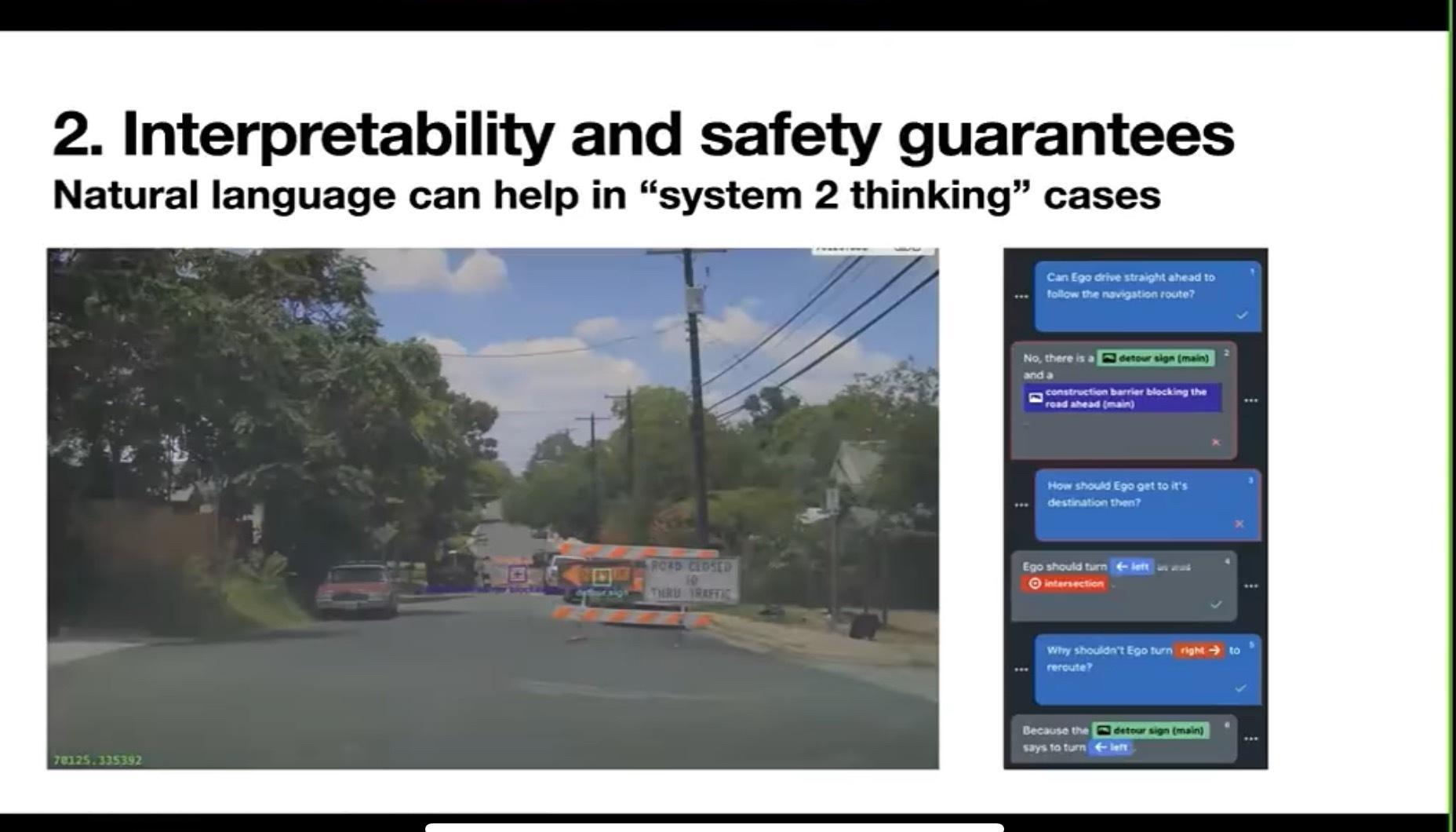 就像我之前提到的,我们也可以使用自然语言与模型交互。同一个模型可以指向某些东西,解释它为什么做出某个决定。我们不需要所有这些来实时驾驶汽车。但如果你确实需要,你总是可以思考更长时间,产生推理标记,然后产生与整个推理一致的正确动作。同样,它可以是运行在车上的同一个模型,但根据情况,可以使用它或者直接产生控制动作。它不需要对每个细节都进行推理,因为如果你对每件事都进行详细推理,那么会花费太多延迟。但在需要的地方,它可以进行更长的推理以产生正确的答案。”