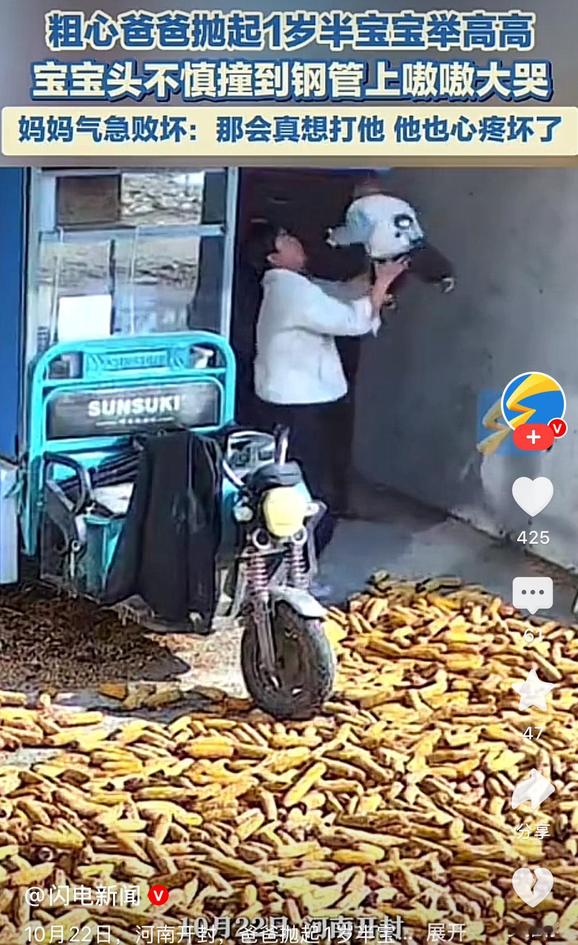 这下出名了, 全国人民都知道了, 竟然有这么大意不靠谱的爸爸, 这位不靠谱的爸爸举高高一岁半的娃,抛起来的时候孩子头磕到钢管上了。 孩子的头磕到钢管上咣当一下,都能听到声音了,接着孩子就吓哭了,嗷嗷的大哭,应该是挺疼的。 看到视频里那位爸爸应该也不是故意的,就是想和孩子闹着玩的,只是没想到会出现这样的情况,孩子妈妈差点心疼哭了。 所以这也给所有的家长提了个醒,举高高这个动作真的挺危险的,千万不要模仿。