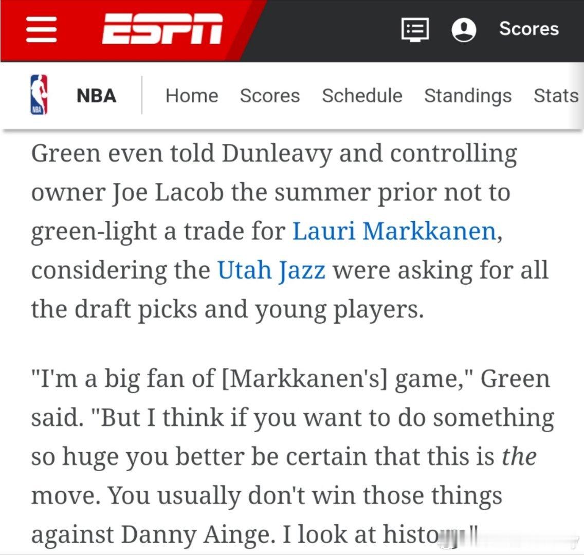 格林透露,曾阻止球队获得马尔卡宁,因当时爵士要价极高,几乎要打包勇士所有年轻球员和选秀权: