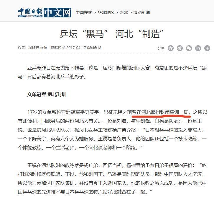 孙颖莎去威海了? 我觉得可能性不大! 河北省队比威海强多了呀, 莎莎去威海干嘛? 河北省队有多强, 可能大家没有概念, 这么说, 日本女队主教练中泽锐, 包括平野美宇的主教练张成, 都是河北队出去的。 美国队的女队主教练高军, 也是河北队出去的。 就连平野美宇在拿到无锡亚乒赛, 打败陈梦拿到冠军之前, 也在河北霸州培训过。 河北官媒还用乒坛黑马,河北制造, 留下了这段珍贵的记忆。 所以,河北有这么好的条件, 莎莎干嘛去威海?