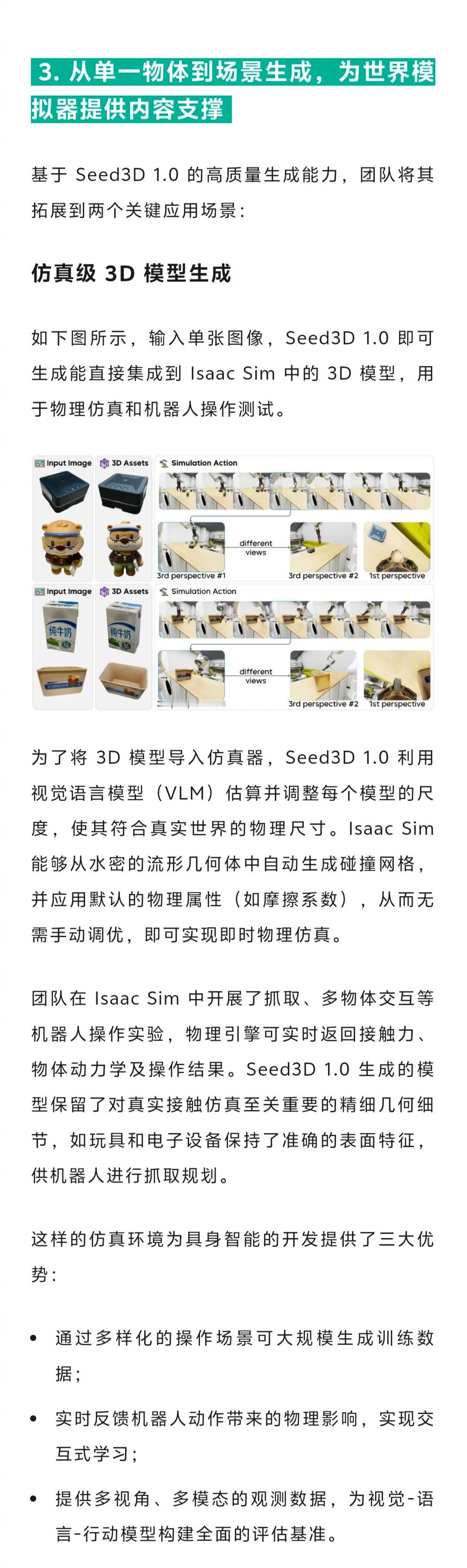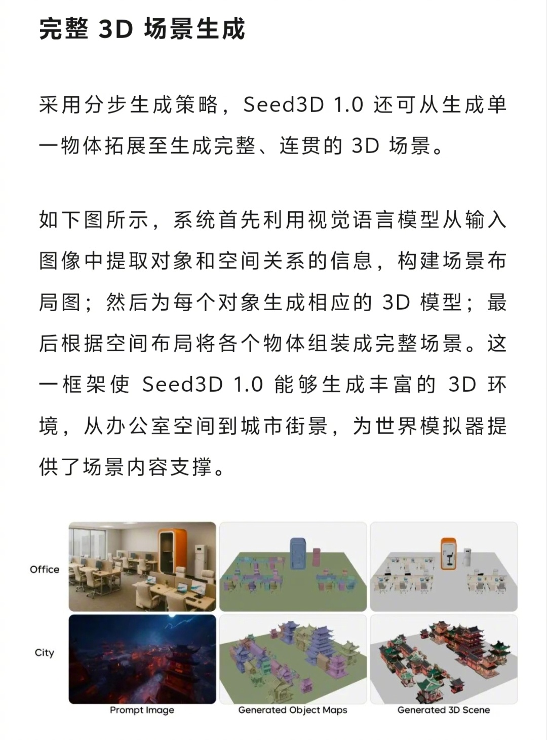字节跳动发布生成高精度3D模型 看了下具体信息,Seed3D 1.0用在机器人研发、虚拟场景搭建等领域,研发成本应该会大幅降低。现在是1.0,到后面的3.0、4.0阶段,应该就比较完备了。