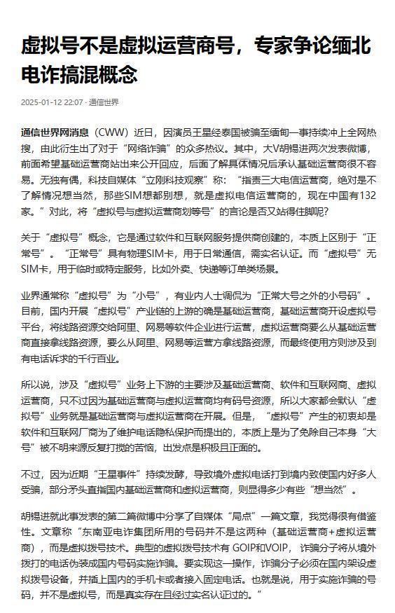 “终于有人站出来了!”男子掷地有声地发出质问:“普通老百姓买机票车票需要实名认证,买电话卡更需要实名认证,我就想问问各大运营商,电信诈骗的虚拟号码为什么就查不到他们的实名呢? 谁能给14亿人一个合理的解释?”首先得弄明白虚拟号和咱们平时用的电话卡不是一回事。 咱们手里的手机号都带张实体 SIM 卡,是移动、联通、电信这三大运营商直接发的,2013 年就开始强制实名,办卡时必须本人到场,身份证刷机器,人脸对着镜头拍,一步都不能少,所以出了事能顺着号查到人。 可虚拟号没有实体卡,本质是靠软件和互联网搭建的 “空中号码”,跟咱们外卖、快递用的 “隐私小号” 算亲戚,但诈骗分子用的那些早被玩出了新花样。 业内人都知道,虚拟号产业链上游是基础运营商,他们把线路资源分给阿里、网易这些互联网公司,再由 39 家虚拟运营商接手运营,层层转手下来,责任边界早就变得模糊。 更关键的是,诈骗分子用的根本不是正规虚拟号,而是 GOIP、VOIP 这类虚拟拨号技术弄出来的 “伪装号”,这玩意儿才是真正的 “查不到实名” 的元凶。 就像杭州拱墅警方抓的案子里,骗子穿着电信工作服上门,给陈大爷家装了一黑一白两个盒子,说是 “反诈设备”,实际上是 VOIP 虚拟拨号机。 这东西能把境外电话信号转成网络信号,远程操控着用国内座机号打电话,来电显示根本没有 “00” 开头的境外标记,谁能想到这是骗子的把戏。 更缺德的是,西湖区还有人被装了 GOIP 设备,这玩意儿能插一堆手机卡,骗子在东南亚就能远程切换号码拨号,受害人看到本地号自然放松警惕,等警方找上门,居民才知道自己成了 “工具人”。 这些设备之所以查不到实名,核心是 “人机分离 + 号码伪装” 的套路。 诈骗分子从境内非法渠道买实名电话卡 —— 就是那些用他人身份办的 “黑卡”,插在国内架设的设备里,再从境外远程操控。 表面看拨出的号码是实名的,但查到的只是卖卡的 “卡头”,真正的骗子早躲在国外了。 去年澎湃新闻曝光的酒店诈骗案更典型,客房里藏的 VOIP 设备由境外 “上线” 操控,民警顺着号码查,找到的只是被冒用身份办卡的普通人,根本碰不到诈骗团伙的核心。 基础运营商其实也想管,毕竟出了事名声不好听,他们会派驻专人核验虚拟号用途,发现涉诈就关停同批次号码。 但架不住链条太长,虚拟运营商依赖基础运营商的资源,互联网公司又掌握着实际运营权,真出了问题容易互相甩锅。 更头疼的是,之前没有专用号段,虚拟号和普通手机号长得一模一样,用户分不清,监管也难溯源。 直到今年工信部才规划 700 号段当 “隐私号专用码”,要区分虚拟号和真实号,还得经过三个月准备、三个月过渡、两年试点,现在正是新旧交替的空档期,骗子自然趁机钻空子。 还有个更绕的点,很多人以为虚拟号就是 “没实名的号”,其实大错特错。 胡锡进转发的文章早就说过,东南亚电诈用的号码,本质是真实的实名电话卡,只不过被骗子非法收购后,通过虚拟拨号设备 “借尸还魂”。 这就好比有人偷了你的身份证办了银行卡,银行能查到 “实名” 是你,但真正取钱的小偷根本找不到。 去年全国破获的电诈案里,近七成涉及虚拟拨号设备,这些案子里的号码全是 “实名” 的,可追查起来全是死胡同,因为实名信息对应的人要么是受害者,要么是卖卡的 “卡农”。 更让人无奈的是技术的隐蔽性。 VOIP 设备能异地拨号,GOIP 能同时用多条线路,骗子就算在缅北,也能把电话伪装成北京、上海的本地号。 民警排查时,往往要等设备频繁拨打电话触发预警才能发现,可这时早就有受害人上当了。 杭州那些案子里,直到反诈中心预警辖区有号码异常群发信息,民警上门才找到藏在居民家的设备,这期间骗子已经用这些号骗了不少人。 说到底,这事儿就像打地鼠,实体卡实名的口子堵上了,骗子就从虚拟拨号的缝隙里钻出来。 基础运营商管得了自己发的卡,管不了被偷的卡;监管部门能出台专用号段,却挡不住技术翻新。 那些喊着 “查不到实名” 的质疑,其实戳中了产业链的痛点 —— 不是没有实名,是实名信息被骗子偷了、卖了、滥用了,而真正的使用者藏在层层技术伪装和跨境链条后面,想顺着号码抓到人,堪比在沙子里找针。