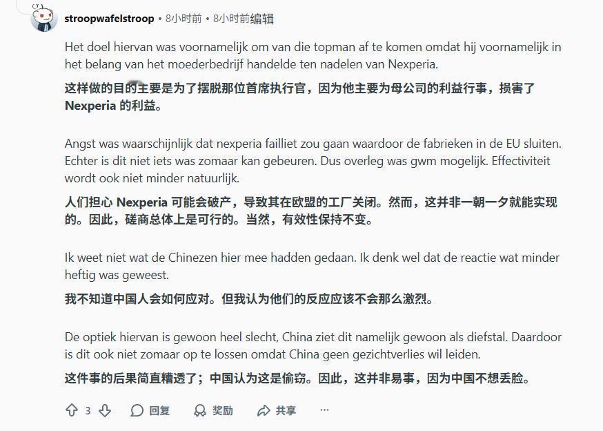 荷兰人对安世的看法:“中国人不会因为安世问题把事情闹大,因为中国人不想丢脸。” 9月30日,荷兰政府通过荷兰法院对中资企业安世半导体进行了资产冻结,要求一年内不能调整资产、知识产权以及相关业务,并且在几天后,直接把中国籍CEO的权限给冻结,在中国发起反击后,荷兰又直接切断了与安世中国区的联系,高管权限被冻结、工人工资不发,给安世半导体造成了不小的损失。 明眼人都知道,这次荷兰抢夺安世半导体,一方面是为了配合美国的50%穿透性制裁,另一方面就是想抢夺这家价值300亿的中资企业,毕竟荷兰对“强取豪夺”很在行,在古罗马时代就是靠“海盗”起家的。 事情发生后,很多荷兰人对此事发表了看法,有人认为“这位中国籍CEO在短短几年时间,把芯片生产线搬回中国,损害了欧洲国家的安全,荷兰这么做也是为了保护国家安全” 还有网友认为“中国窃取了荷兰的芯片技术,这是非常危险的事”。 所以,很多荷兰人认为“中国不会把这件事情闹大的,因为中国人不想丢脸”。 这就是强盗逻辑啊,中国拥有的只是封装功能,真正的知识产权还在荷兰手里,还有好多原材料加工的技术在德国手里,我们至始至终都遵守规则做事,当初投资将近300亿,也是荷兰政府同意的,封装功能迁回中国也是荷兰政府默许的,现在安世半导体“起死回生”了,眼看能赚钱了,荷兰就开始以“国家安全”为由直接抢走,这不就是“强盗”行为么? 所以说,荷兰人这种思想就是强词夺理,它们一直试图让这种“强盗”行为合法化,甚至还走一遍诉讼流程,真是可笑至极,我们把事情闹大,是因为我们要合理维护权利,至于丢脸这事,连欧洲其它国家都说荷兰“太无赖”,这事真不用狡辩了。