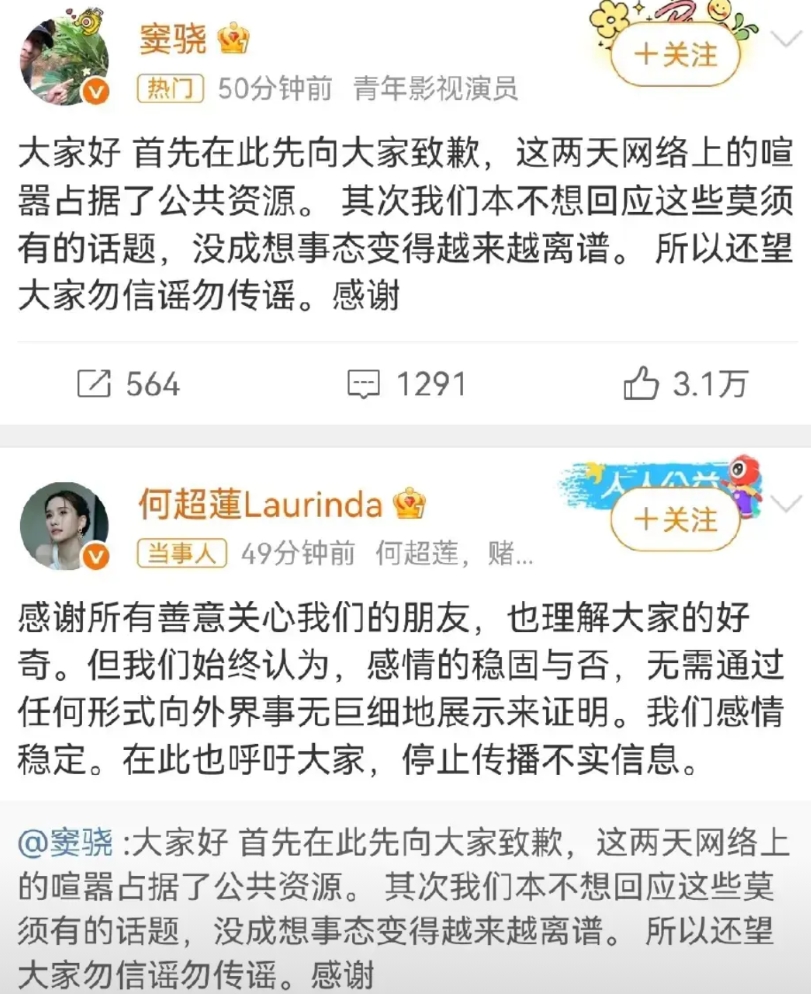 从时间上看俩人前后脚发文,窦骁先出来说话,道歉占用公共资源,明确说网上都是瞎编的,别信也别传。紧接着何超莲也转发补充,说他俩感情好得很,不用天天晒来证明。