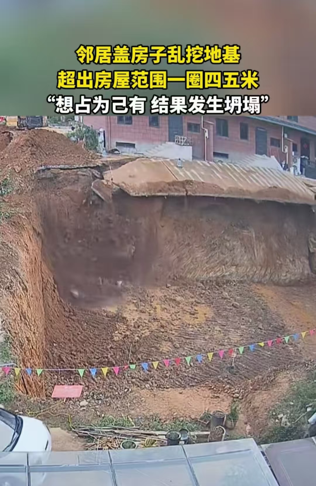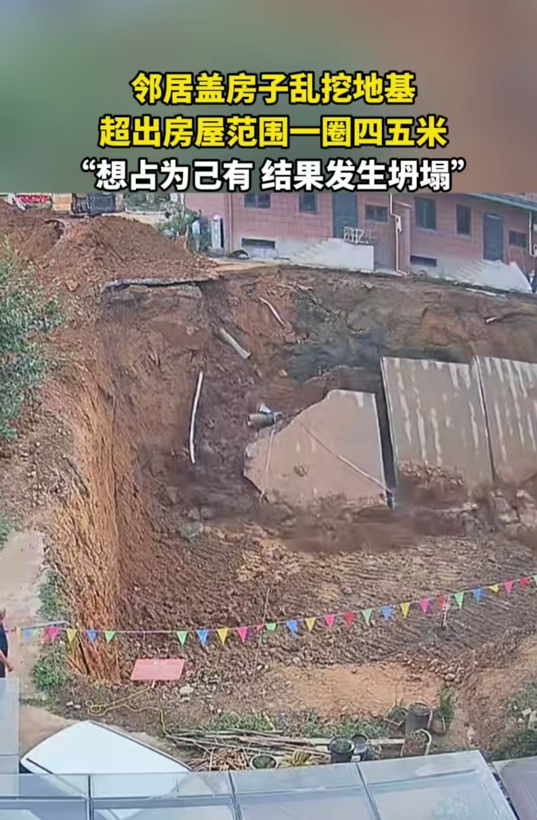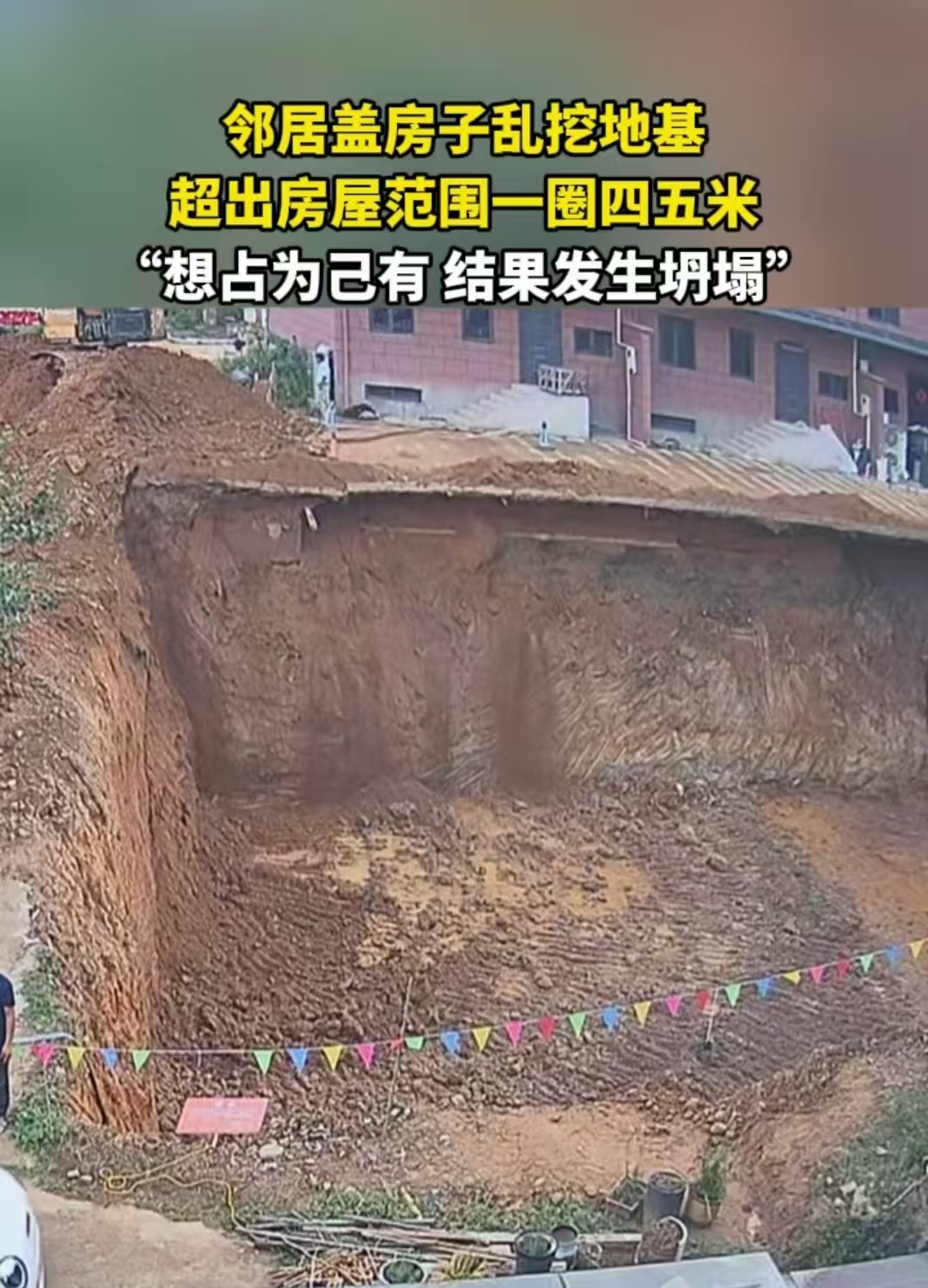 这就是报应!邻居盖房子乱挖地基,超出房屋范围一圈四五米,想据为己有,但万万没想到,地基发生塌陷……