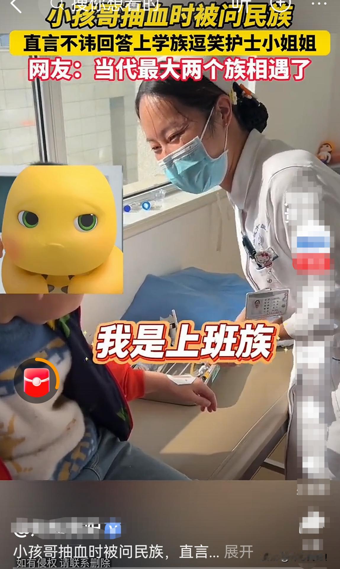 当今两大族相遇的对话: 护 士:你是什么族? 小孩哥:嗯哼? 护 士:哪个民族? 小孩哥:上学族! 护 士:哈哈哈…… 小孩哥:您呢? 护 士:我上班族!