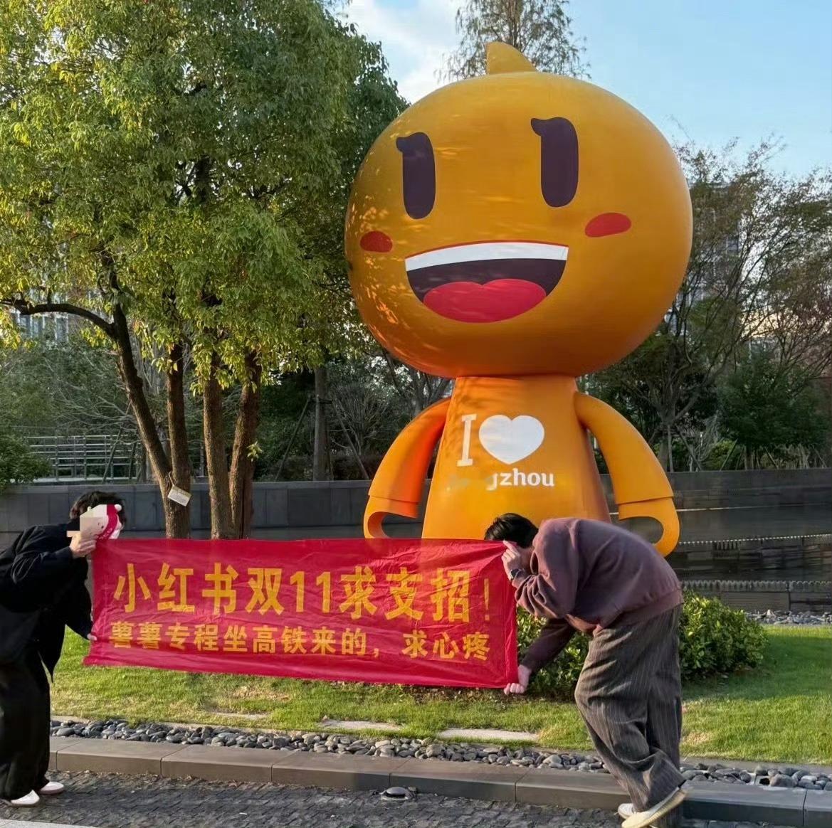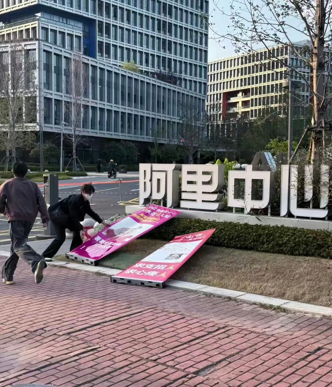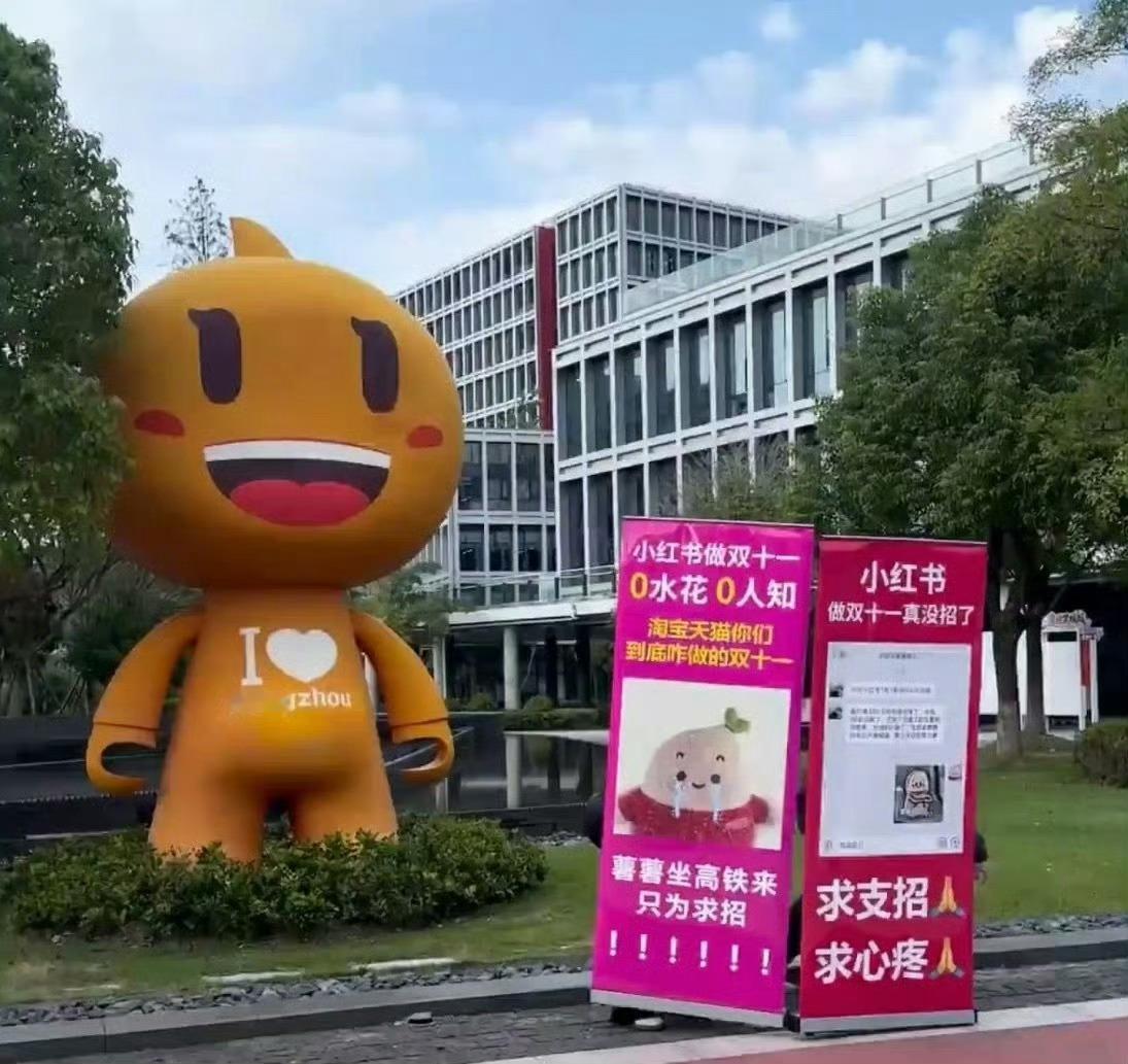 这是什么操作?小红书在阿里门口摆了个求支招的易拉宝。易拉宝还被风刮跑了……
