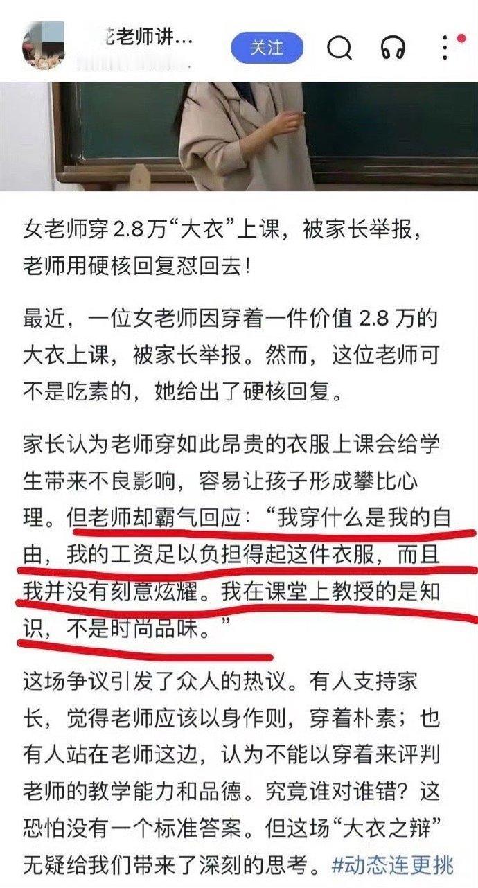 老师现在工资这么高吗?最近有位女老师穿了件2万8的大衣上课,结果被家长反手一个举报。 先不说别的,反正要我看,光从照片或远处看,根本看不出这件大衣要这个价——款式相当简约素雅,穿着讲课也很得体,并没有什么不妥。 人家老师直接硬核回复怼了回去,要我说,怼得没毛病。 工资不高,不代表家底不厚啊。 我身边就有现成的例子:亲戚家孩子一个月就挣五千多,但手上戴的表六万多。怎么了?不行吗?——家里条件好,父母愿意给买,这不挺正常的吗? 老师也一样。可能人家家境本来就好,也可能是配偶收入高。穿什么衣服、戴什么表,那是个人选择,只要不影响教学、不违背师德,真没必要上纲上线。 与其盯着老师穿什么,不如多关注她教得用不用心、对孩子负不负责。老师形象得体、专业过硬,不就够了吗? 大家觉得呢?