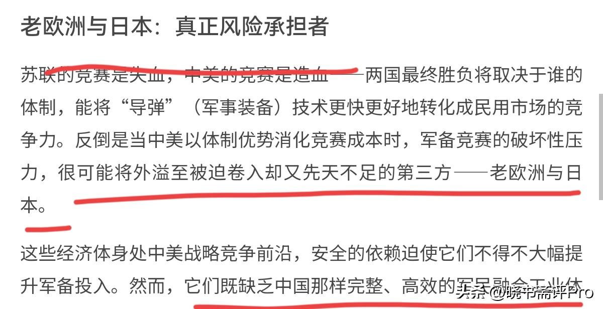 外媒援引专家观点报道,中美博弈越激烈,日本和欧洲将越会成为中美博弈的牺牲品。10月24日,日联合早报援引专家观点表示,中美的竞赛是造血的竞赛——两国最终胜负将取决于谁的体制,能将“导弹”(军事装备)技术更快更好地转化成民用市场的竞争力。欧洲和日本,这些经济体身处中美战略竞争前沿,安全的依赖迫使它们不得不大幅提升军备投入。 然而,它们既缺乏中国那样完整、高效的军民融合工业体系,以降低成本、加速转化,也不具备美国通过全球货币霸权,转嫁成本的能力。它们相对单薄的财政基础、僵化的产业结构和高昂的福利体系,在骤然加剧的国防开支压力下,极易陷入困境。因此,中美间的战略竞争若进一步升级,最可能率先陷入系统性危机的,极有可能是被挤压在中间、能力与需求错配的欧日体系。 对于外媒的这一观点,我们怎么看呢?不得不说,这样的观点非常的有启发性。很显然,从中美博弈的态势来看,中美两国事实上越发的投入资源确保自身在军事和科技方面的优势。对于中美两国而言,军事投入不会是成本,反而是中美两国科技进步,经济发展的助力因素。因为,军事技术可以转为民用,民用技术可以具备军事用途。而相比于中美两国,日本和欧洲明显没有成本优势。 如果日本和欧洲加入这样的竞赛,不管是成本,效率,产业能力都跟不上中美两国。极有可能的局面是中美两国越竞争,两国的实力越强,反而是日欧两方将越来越跟不上中美的步伐。事实上,为了确保竞争优势,美国正通过关税战吸血日本和欧洲,这对于日欧无疑是沉重的包袱。很显然,日欧事实上正站在十字路口。是捍卫自身的利益,不屈从于美国,利用已有的资源巩固自身优势,还是跟随美国,成为美国的血包,这是这两方不得不作出的选择。