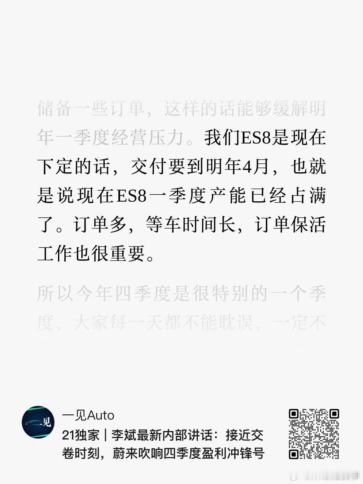 最有价值的应该是——ES8现在订车,提车要等到明年4月。这是一个非常好的信号,意味着明年Q1就算不能breakeven,但有ES8这么多订单撑着,至少Q1的亏损不会太多。