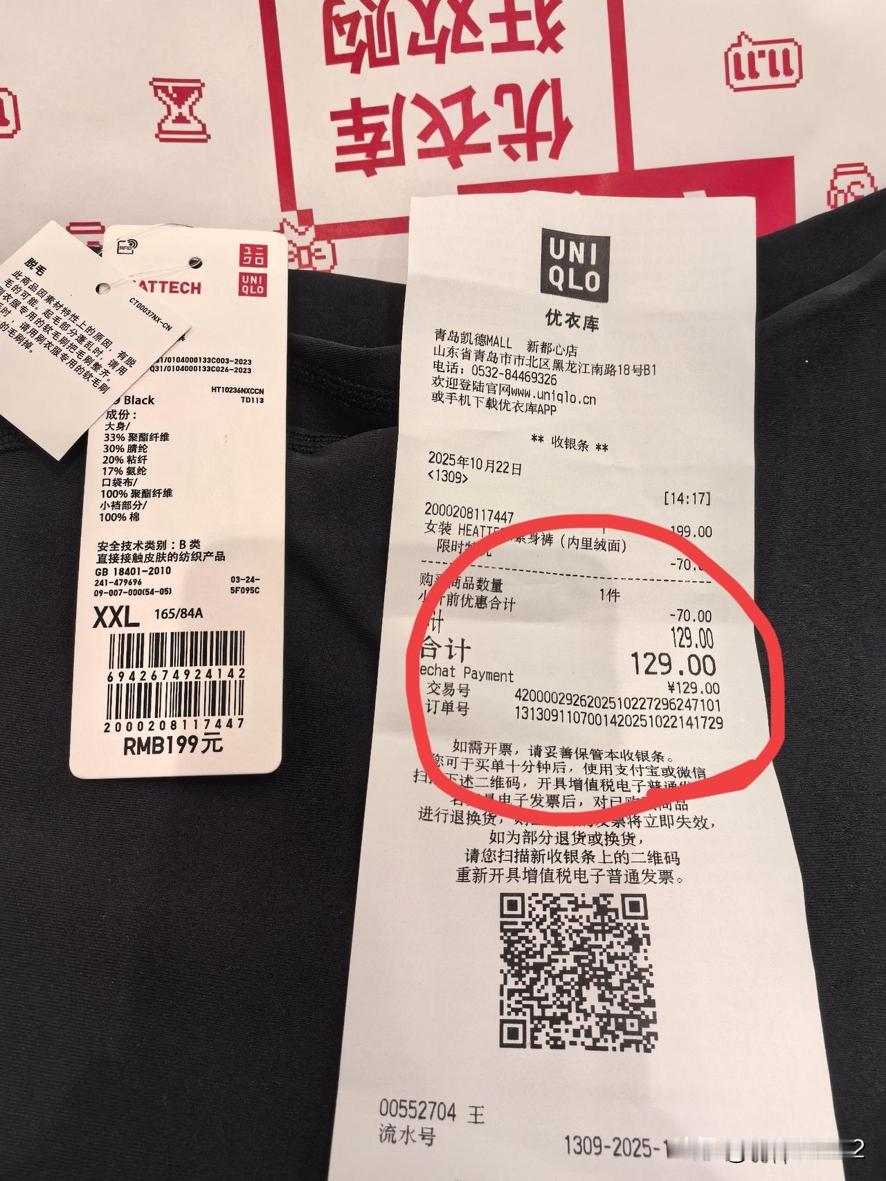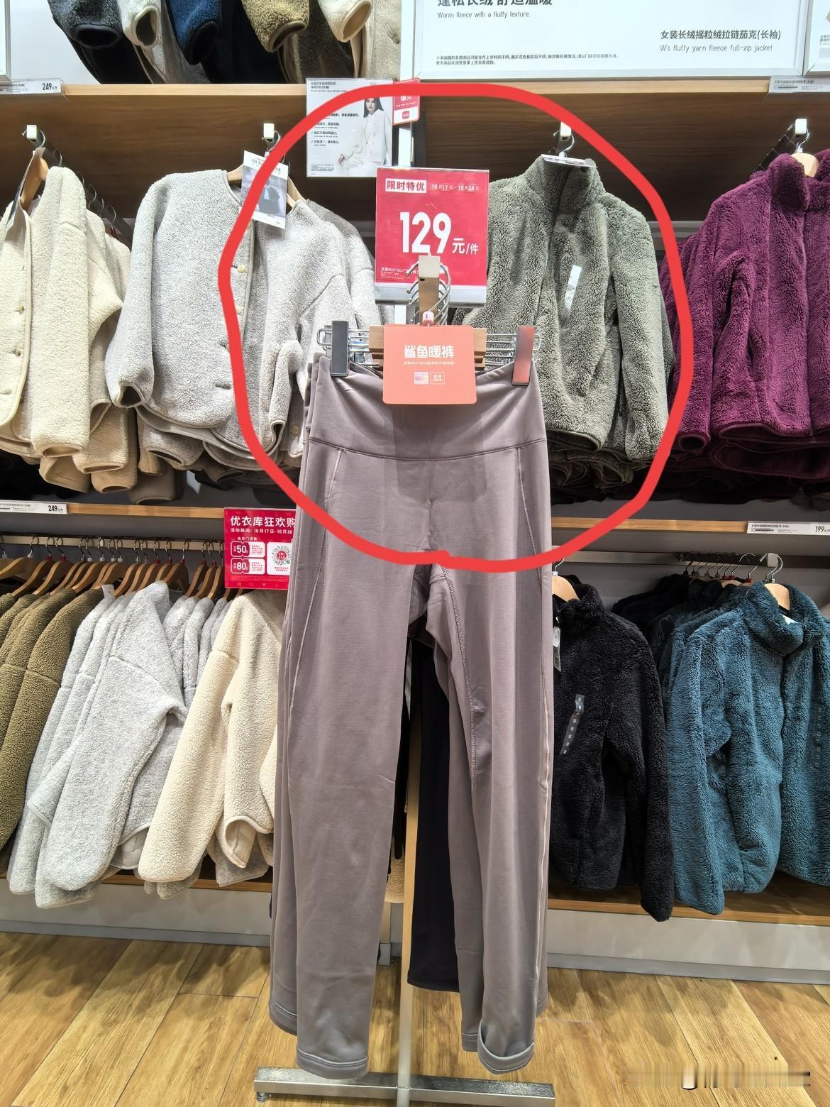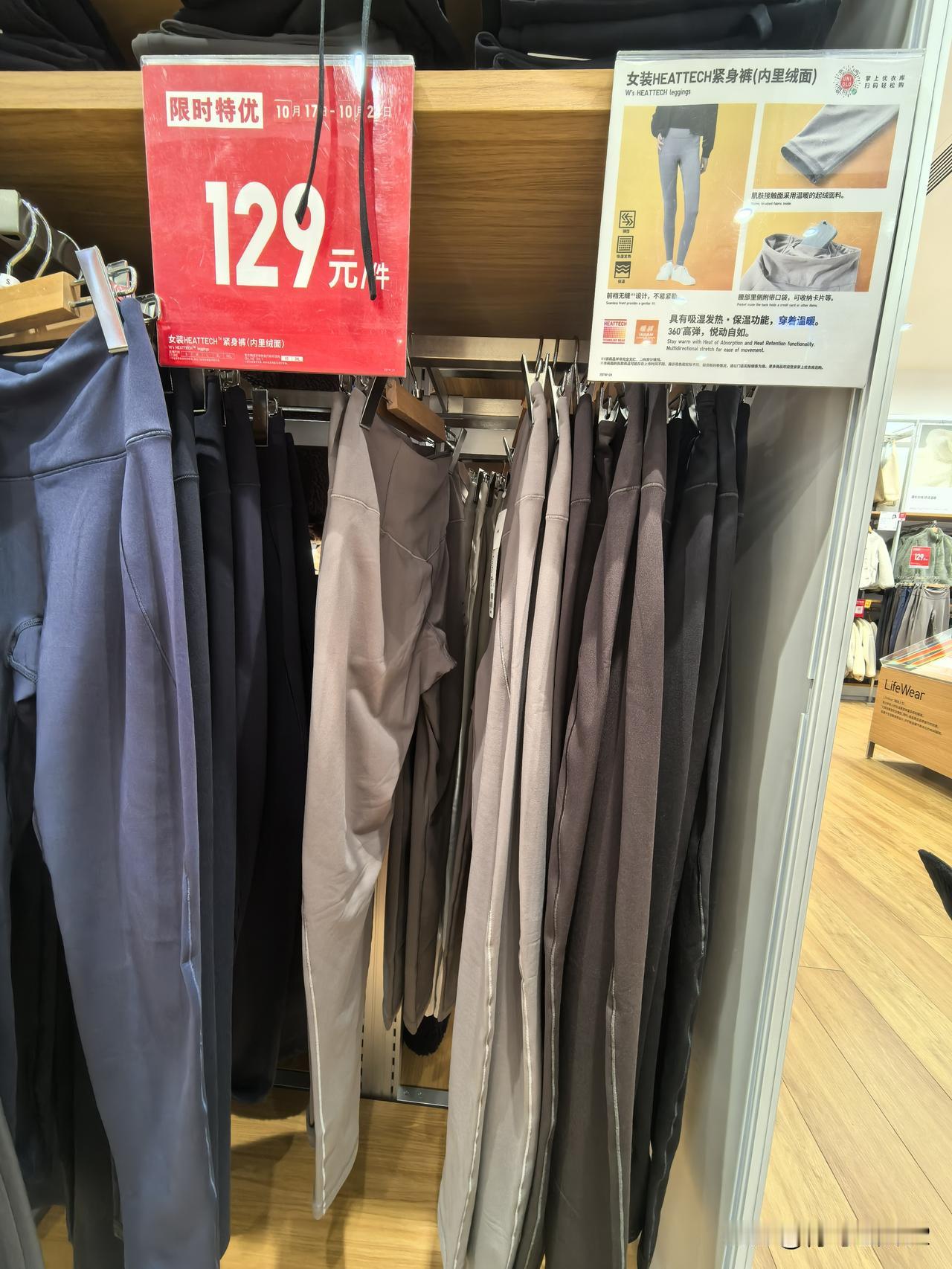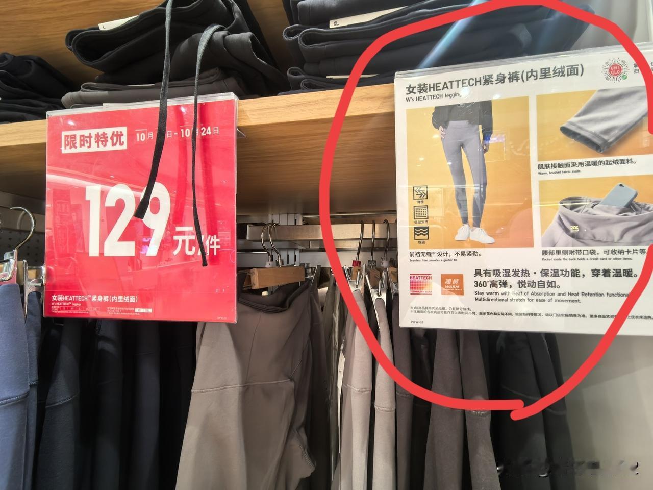 我在优衣库买了一条〝鲨鱼暖裤〞,如图示,也叫紧身裤,内里是绒面,今天穿在身上后,感觉舒服又暖和。正如优衣库标签上介绍的一“吸湿发热保温,360度高弹,悦动自如”。 它原价199元,优惠了70元,现价129元。 我感觉比它正在买的那款保温发热的春秋裤性价比高,因为我去年买了一条,昨天曾经穿过,今天再穿这一条,明显感觉这一条保暖性更胜一筹。 今天是促销价的最后一天,有兴趣的朋友不妨过来了解一下哈