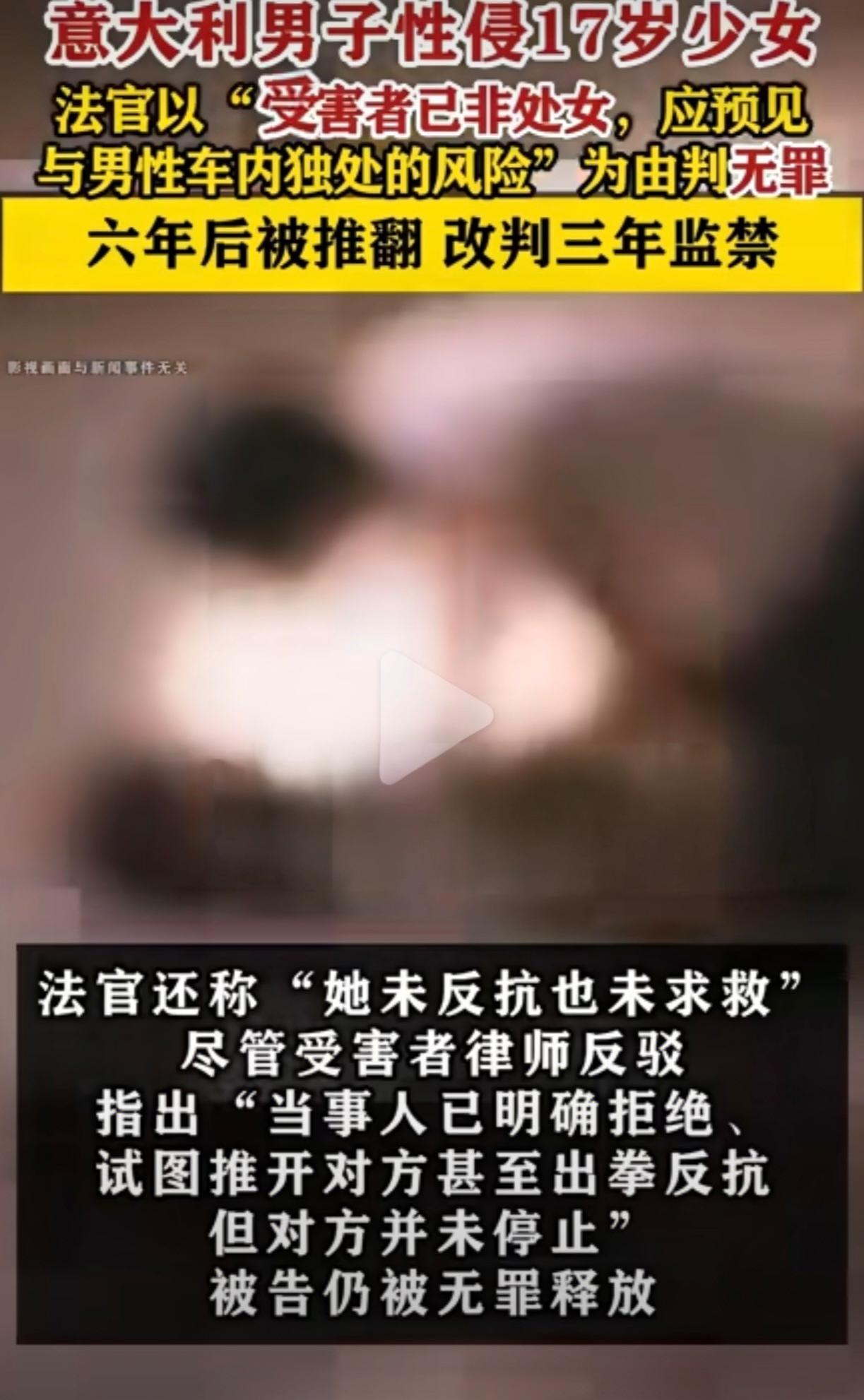 离谱,离大谱。事情发生在意大利。一名17岁少女在车里被一个31岁的男子性侵。本以为男子会受到法律严惩,没想到,法官竟然以“你不是处女了,所以应该知道单独和男的在车里会发生什么啥”为由,判男子无罪[what][what]。更无语的是法官还说“女生没反抗,没有喊救命”。然后,罪犯就这样逍遥快活了六年。 判决曝光后,引起了当地人的强烈谴责,这一判决才被推翻,罪犯最后又重新被判了三年监禁。从来没见过这样的事,真是开眼了,果然,这个世界越来越颠了[泪奔]。