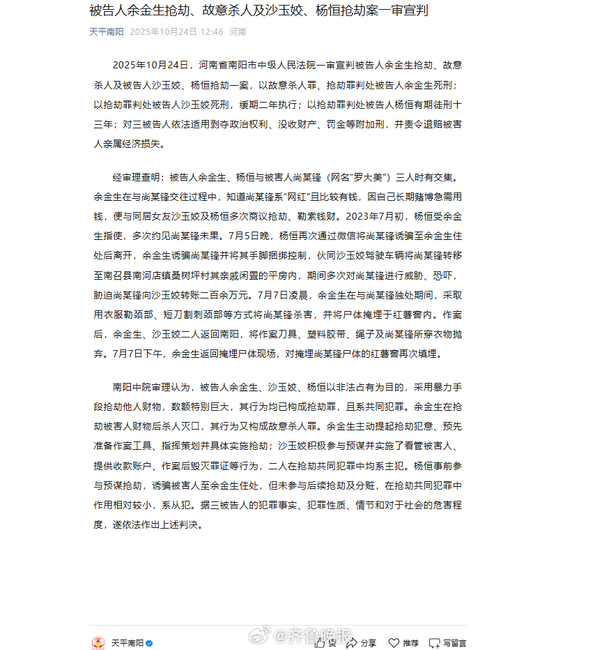 【#网红罗大美遇害案一审宣判#】2025年10月24日,河南省南阳市中级人民法院一审宣判被告人余金生抢劫、故意杀人及被告人沙玉姣、杨恒抢劫一案,以故意杀人罪、抢劫罪判处被告人余金生死刑;以抢劫罪判处被告人沙玉姣死刑,缓期二年执行;以抢劫罪判处被告人杨恒有期徒刑十三年;对三被告人依法适用剥夺政治权利、没收财产、罚金等附加刑,并责令退赔被害人亲属经济损失。