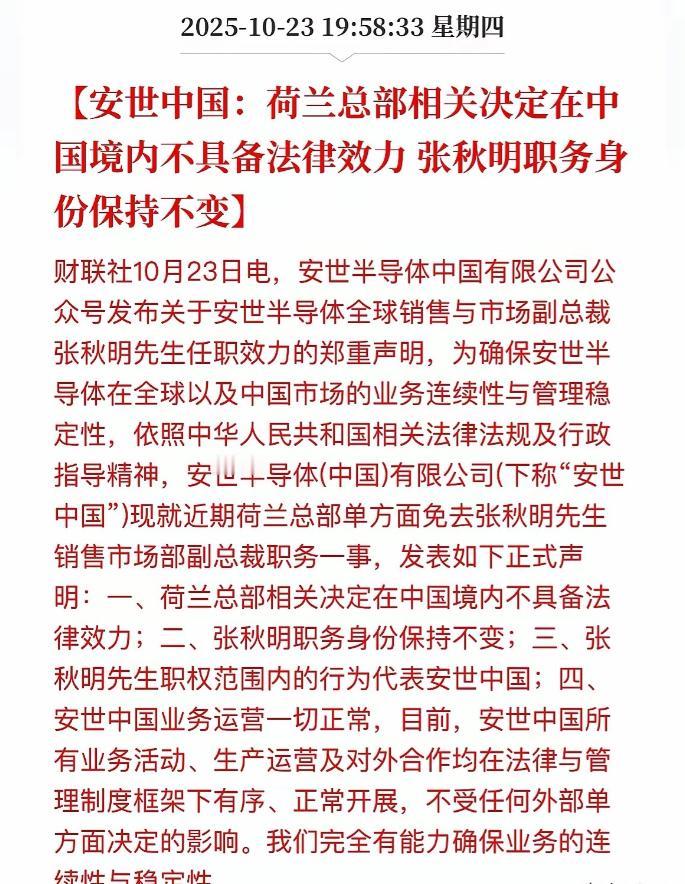 荷兰请你记住了! 荷兰总部一切决定在中国都是无效。 别整天没事找事当美国政府的跑腿。 安世中国表明张秋明职务身份不变,其职权内的任何行为都代表安世中国。 强盗国家真是流氓啊。基本的企业契约逻辑都不顾,看中就抢。那我们说我们看中飞利浦,也可以把飞利浦抢来么?世界还要做生意了么?? 荷兰坏得很,历史上对华坏事没少干。阿斯麦(ASML)不是一直协助老美往死里卡中国嘛! 对此你怎么看?