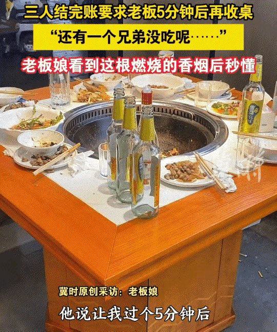 江苏泰州有三个大哥去饭馆吃饭,结完账跟老板娘说等5分钟再收桌,说还有个兄弟没吃。老板娘一开始以为人没到,结果等了会儿也没人来,往桌上一看,有盘没动过的菜,旁边还点着根烟,仨人就站在外面,等烟燃完才走。 老板娘这才明白,他们是在等过世的兄弟“吃好饭”,这是当地祭奠先人的风俗。网友说,估计是吃饭时他们就给过世兄弟夹菜了,最后点烟是因为兄弟生前爱抽烟。这事儿真挺感动的,人走了还被朋友记着,这份情谊太难得,能有这么交心的兄弟,这辈子值了!