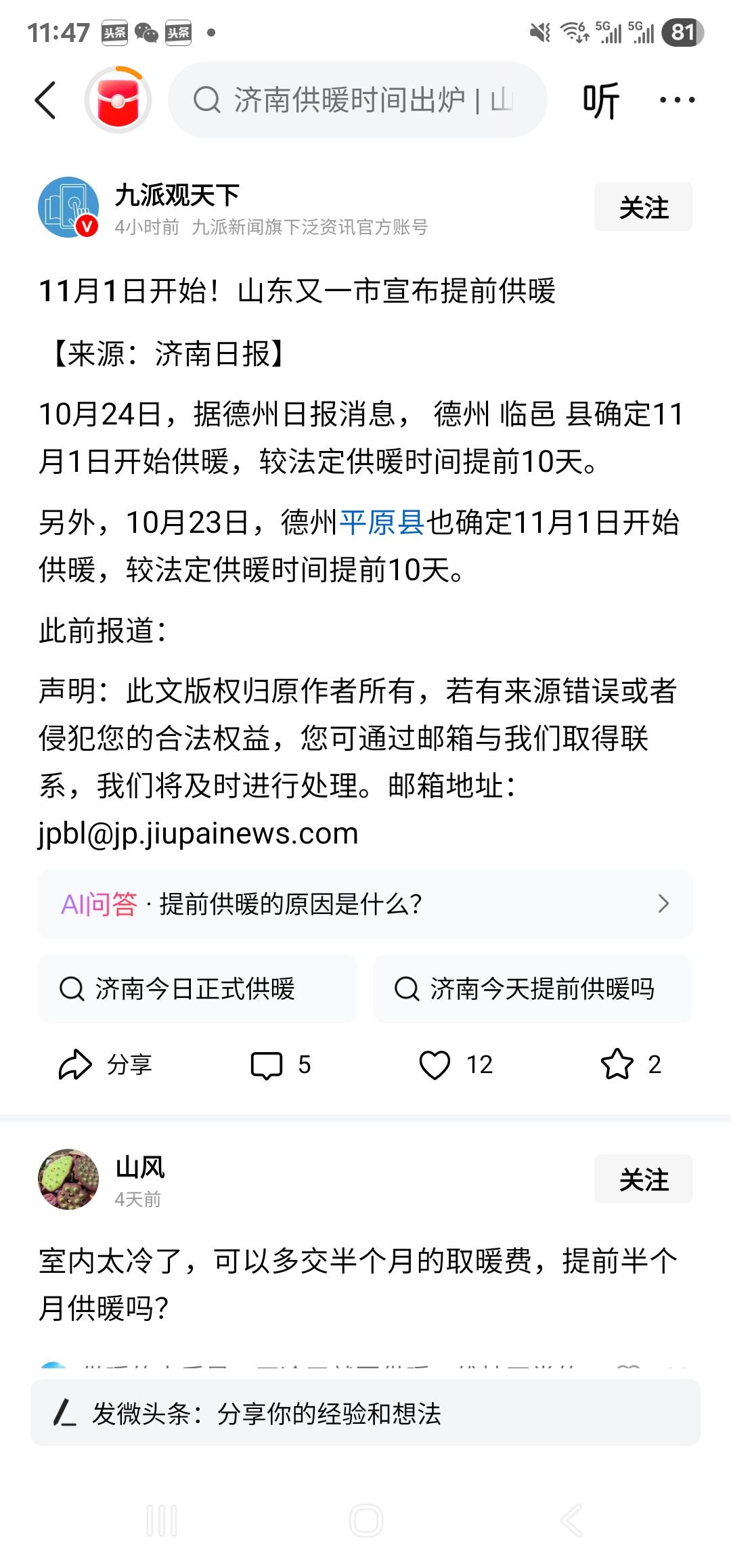 今年山东的确冷的早!全省临沂第一个宣布提前供暖,第二个宣布提前供暖的是德州。 两个地区,不约而同,都是11月1日正式供暖,较往常提前了十来天。 估计后面, 会有更多的地市宣布提前供暖。 毕竟距离11月1日,不到一星期了。