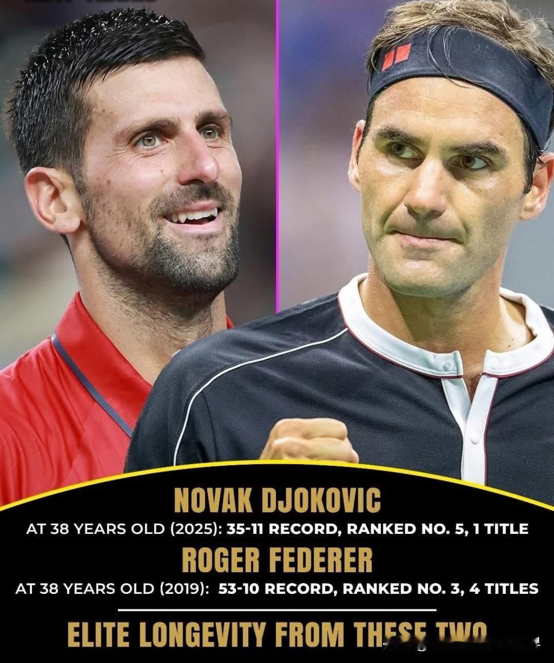 诺瓦克·德约科维奇 38 岁(2025 年):战绩 35 胜 11 负,排名第 5,夺得 1 个冠军 罗杰·费德勒 38 岁(2019 年):战绩 53 胜 10 负,排名第 3,夺得 4 个冠军 这两位球员的职业生涯末期仍然保持很高的竞争力,不过德约科维奇不断尝试赢得大满贯冠军,而费德勒在同一个年龄只参加一些小型锦标赛,所以说塞尔维亚人想要超过103冠是很简单的事情,只需要打250赛。