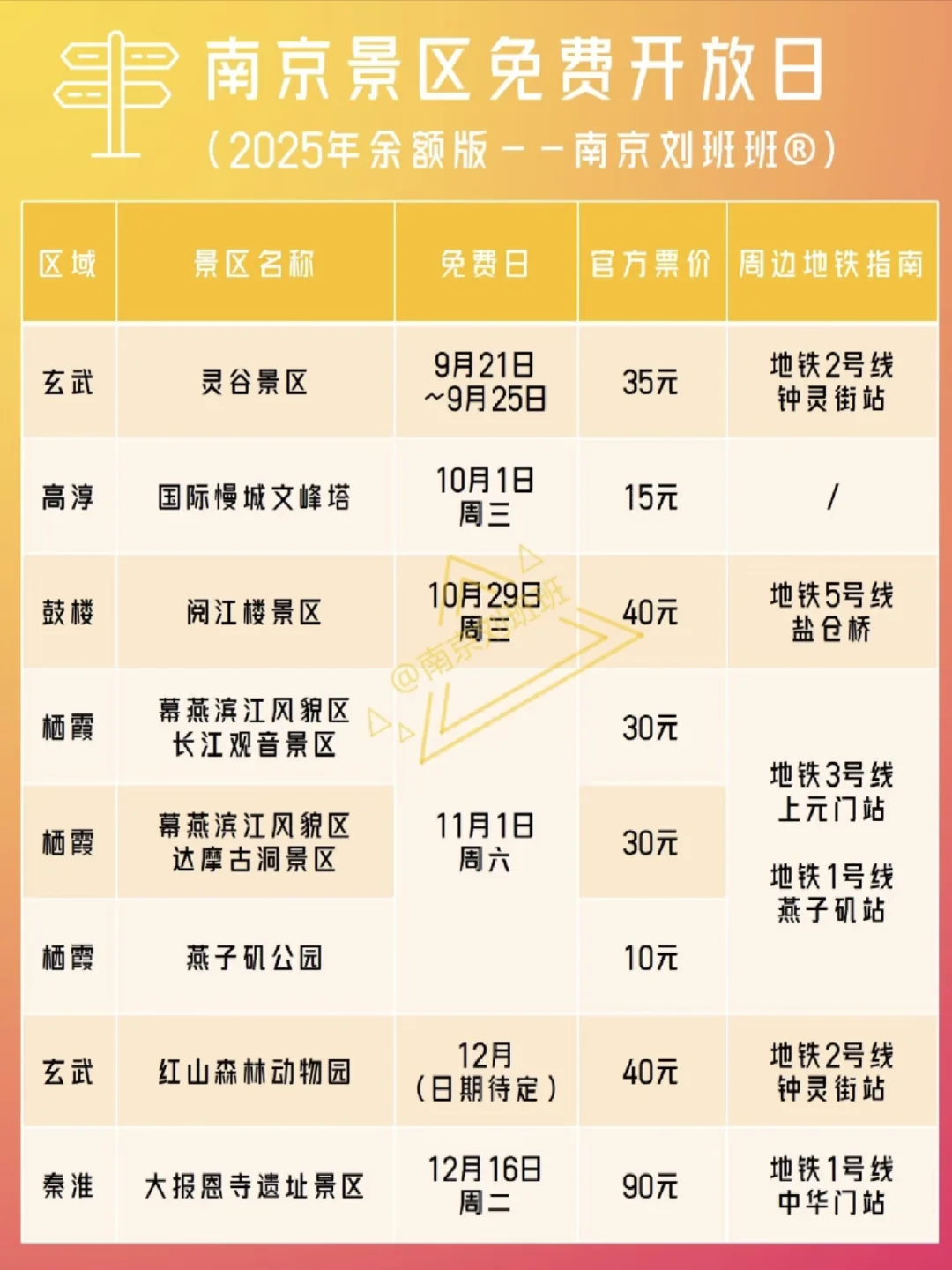 💥11/12月即将来临,南京还有燕子矶公园、达摩古洞景区、长江观音景区、红山森林动物园、大报恩寺遗址景区会陆续迎来免费开放日,也将持续给大家更新~