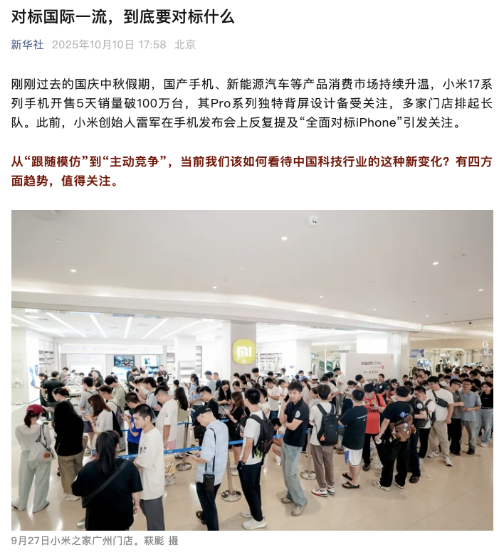 要知道随着人民日报、新华社接连点赞,小米早已跳出“手机厂商”标签,成为中国创新实力递给世界的鲜活注脚。