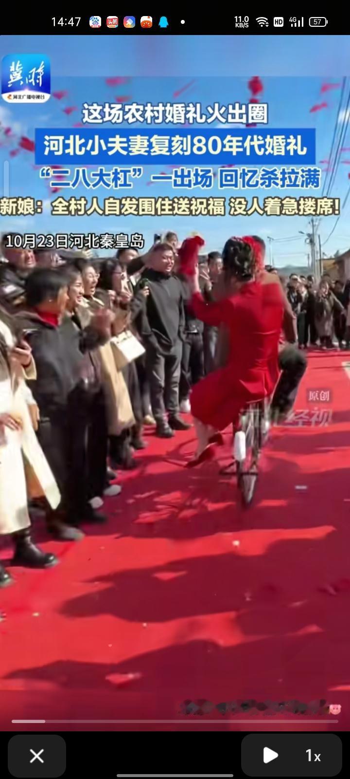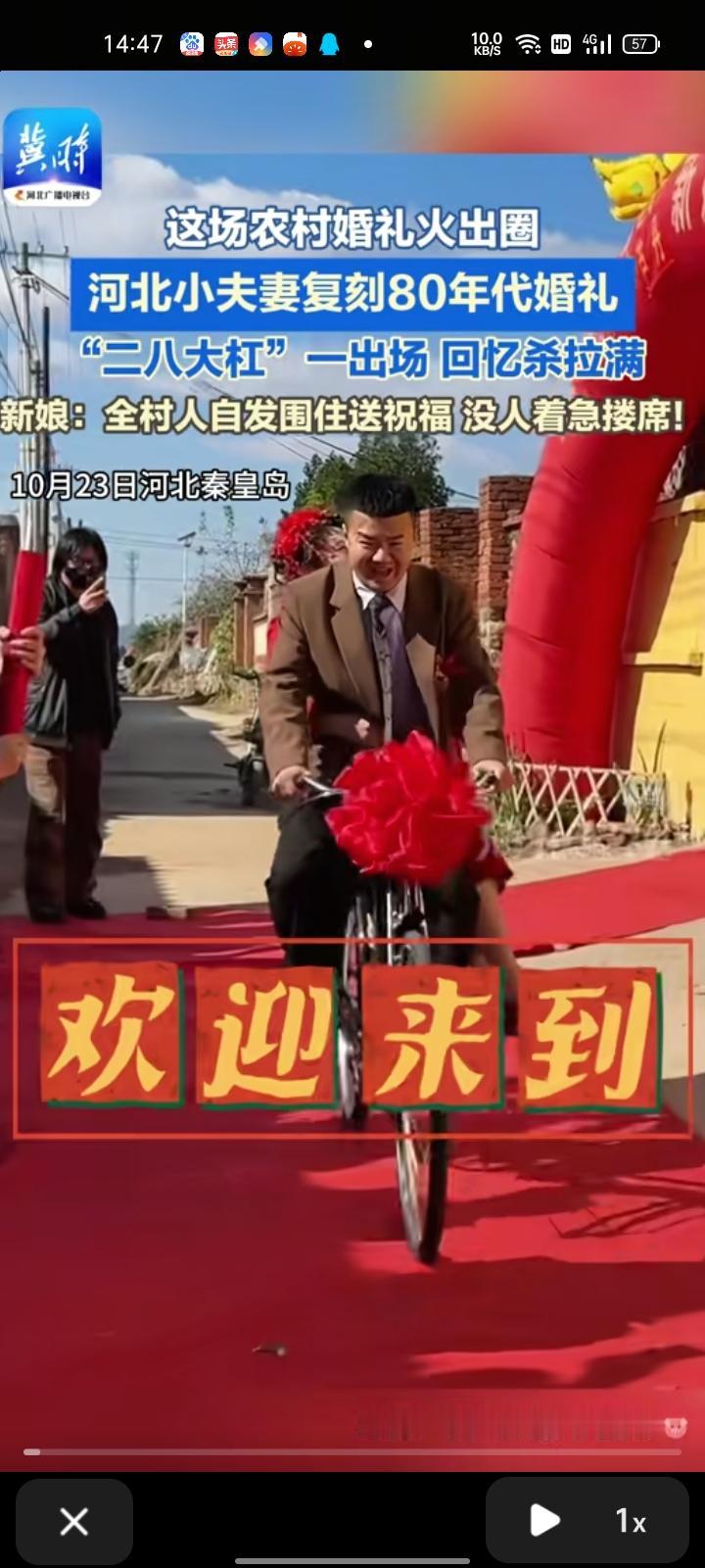 10月20日,河北秦皇岛。小夫妻复刻80年代婚礼火爆网络,视频中,一对夫妻骑着二八大杠在这里游走,不少村民拿出手机拍摄。 新娘芦女士表示,所有人自发在台前围住送祝福,没人着急搂席,那一刻大家心里想到他们年轻时的婚礼,或者爸爸妈妈的婚礼