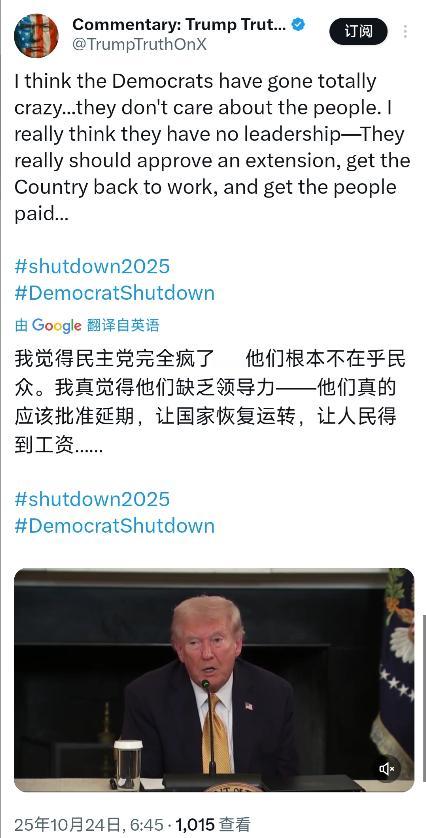 特朗普今天(北京时间10月24日)表示:“我觉得民主党完全疯了.…他们根本不在乎民众。我真觉得他们缺乏领导力——他们真的应该批准延期,让国家恢复运转,让人民得到工资......”   这次政府关门,根子是医保补贴的事儿。民主党说要把快到期的《平价医疗法案》补贴续上,这样能帮到2400万美国人;共和党不乐意,说先把临时拨款法案过了,让政府先干活再说。两边在参议院掰扯了12回投票,每次都是54票同意、46票反对,就是够不上60票的门槛。更离谱的是,众议院从9月19号起就直接“躺平”休会了,连坐下来谈的机会都不给。   最倒霉的还是普通老百姓。华盛顿特区的联邦员工排着几十米的长队领免费吃的,空管人员因为没工资好多人不来上班,导致快两万架次航班延误,休斯敦俩机场甚至一度停摆。美国交通部长都警告了,下周空管人员拿不到全额工资,航班乱子还得变大。   更吓人的是,负责维护核武库的国家核安全管理局,已经有1400人休假了,就剩400人硬撑,连承包商都因为没钱快干不下去了。   就在大家日子这么难的时候,特朗普的“豪华宴会厅计划”倒推进得飞快。白宫东翼都拆得底朝天了,3.5亿美元的私人捐款也到位了,新宴会厅要从能坐650人扩到999人,他还说这是“招待外国领导人有面子”。特朗普特意强调“这钱是我和朋友捐的,不花纳税人的钱”,可谁知道这些“爱国捐款”里,有多少是军工巨头或者能源公司给的?心里都有数。   另一边,联邦政府已经开始裁人了。教育部裁了20%的员工,连管残障儿童教育的部门都快没人了;国土安全部把网络安全专家给开了,FDA审批药品的事儿也停了。更荒唐的是,卫生与公众服务部还搞出“误裁”的乌龙,把负责防麻疹、埃博拉的专家都解雇了,后来没办法又紧急叫回来。   按现在这僵局,11月6号是个坎儿。要是参议院27号复会后还谈不拢,政府停摆天数就会超过之前的35天,特朗普就成了美国历史上“最会让政府关门”的总统。但他真的想破这个纪录吗?   从政治上看,共和党好像打算跟民主党耗到底。白宫官网甚至挂了个“民主党导致政府关门时长”的实时倒计时,把锅甩得干干净净。民主党呢,还指望医保补贴到期后老百姓有意见,觉得共和党最后扛不住会让步。可实际情况是,两党都在赌对方先服软,把老百姓当筹码。美国《纽约时报》做的民调显示,快三分之二的人觉得国家“根本解决不了自己的问题”。   政府停摆对美国经济的打击可不是小事,简直是“灾难级”的。白宫算过,每周要少150亿美元的GDP,可能有4.3万人失业,老百姓花的钱也少了300亿。更可怕的是,停摆这段时间,美国国债突破了38万亿美元,未来十年光利息就要花14万亿美元,相当于每个美国人要多背4万美元的债。穆迪早就把美国的信用评级从AAA降到Aa1了,投资者也越来越没信心。   像航空公司、旅游业、农业这些靠联邦政府服务的行业,日子更难过。美国旅游协会算过,停摆一周就损失10亿美元,国家公园每天少收100万美元门票,周边的小店也跟着倒霉。农民拿不到补贴,企业因为没数据没法规划,连美联储都跟“在雾里飞”似的,不知道该加息还是降息。   现在看,两党想妥协几乎不可能。共和党控制的众议院坚持“先拨款再谈别的”,民主党非要“把医保和预算一块儿解决”。参议院多数党领袖图恩都说了“没打算谈,除非民主党改主意”。   更麻烦的是,特朗普好像还挺乐意这样,他好几次说“共和党在舆论上占优势”,甚至威胁要借着停摆“裁掉更多政府员工,砍掉民主党的项目”。唯一的变数是参议院27号复会后会怎么样,要是共和党愿意在医保补贴上让一步,或者民主党同意分步骤解决,说不定能打破僵局。但以美国两党现在这么对立的样子,这种可能性比中彩票还低。毕竟,在“政治正确”面前,老百姓的饭碗、国家的经济,好像都没那么重要。   其实不管这次停摆有没有打破35天的纪录,美国老百姓都已经输得底朝天了。白宫的宴会厅越建越豪华,议员们吵得越来越热闹,可普通美国人还在为下个月的房租、孩子的奶粉钱发愁。   这就是特朗普说的“让美国再次伟大”吗?或许,真正需要“伟大”的不是政府停摆的天数,而是两党能放下成见,实实在在为老百姓办事的决心。可在现在这种“你反对我就赞成”的政治环境里,这样的决心,恐怕比让政府停摆35天还难。