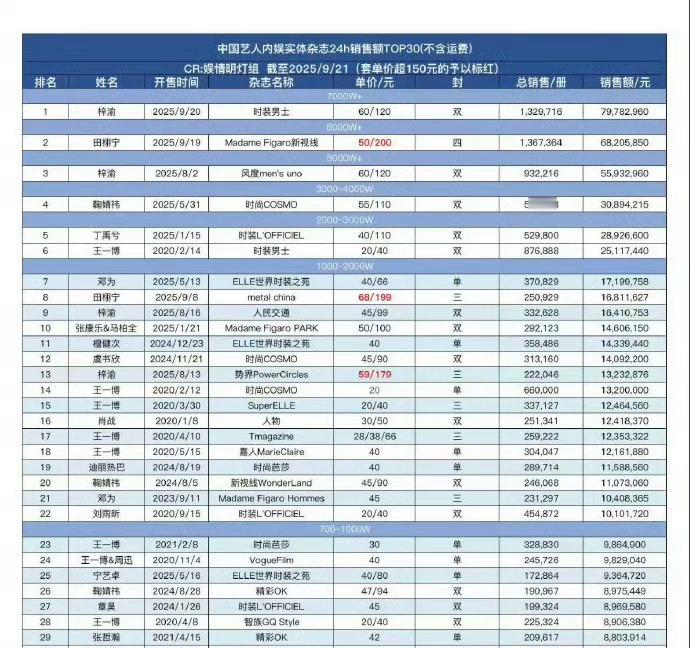 梓渝是杂志大王吗?这杂志销量只能说粉丝太牛了,第一第二是梓渝田栩宁,但梓渝在榜单的名次有点多啊![淚奔][淚奔][淚奔]梓渝一天五套造型梓渝杂志