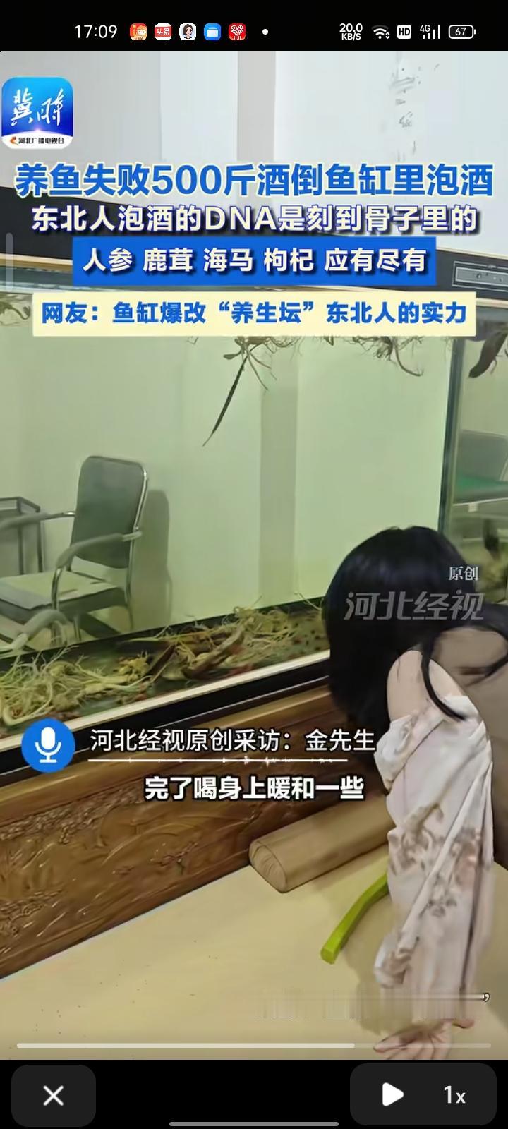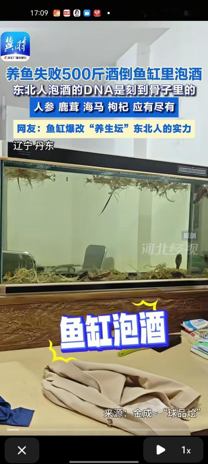 10月3日,丹东市宽甸县。东北人泡酒的DNA是刻在骨子里的,网友发视频称,养鱼失败后把500斤酒倒在鱼缸里泡酒,人参、鹿茸、海马、枸杞应有尽有,长这么大自己头一次见用鱼缸泡酒。东北冬天比较冷,喝了酒身上暖和一些。