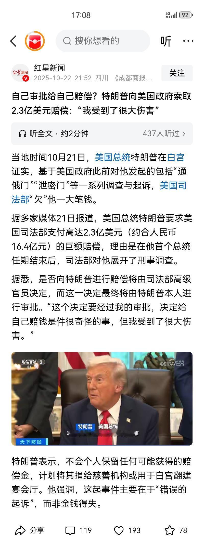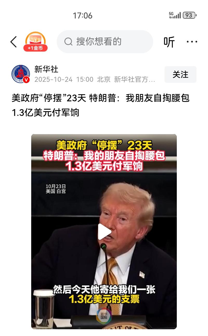 《特朗普:“我有个朋友”》我说这话咋这么熟呢?我也有个朋友,他天天在头条上问:“肾虚,吃什么比较好?” 整的虚头巴脑的, 各位,真不是我,真不是啊! 我朋友! 大家还是关注一下重点, 🟢️特朗普朋友自掏腰包1.3亿美元付军饷🟢️特朗普律师团队把美国政府告了,赔付2.3亿美元给特朗普! 这两件事情之间无关紧要的联系。 图一新华社新闻报道:美政府"停摆"23天 特朗普,我朋友自掏腰包1.3亿美元付军饷 图二红星新闻报道:自己审批给自己赔偿?特朗普向美国政府索取2.3亿美元赔偿:"我受到了很大伤害" 💡小葵花妈妈课堂开课了: 2.3亿-1.3亿=??? 大家觉得剩下的钱,特朗普会用来干什么[马思纯的微笑]