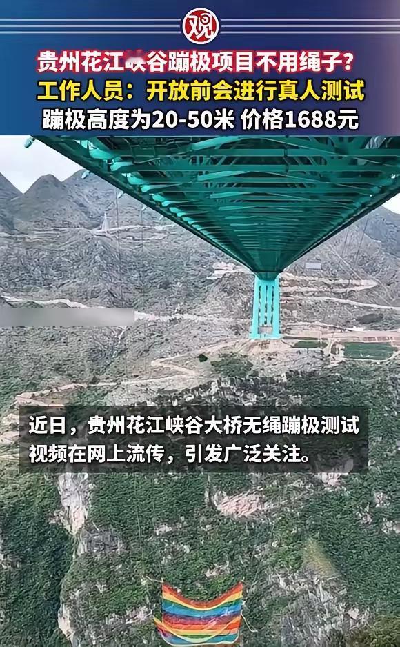 网友吐槽贵州花江峡谷不系绳蹦极项目叫“花钱找死”后被叫停。 近日,贵州花江峡谷大桥无绳蹦极,引发热议。工作人员称,20-50米高度自选,无绳蹦极价格为1600余元,低于有绳蹦极的2999元,下方有160-170平米安全网接住,目前200斤沙袋已测试成功。据悉,贵州花江峡谷大桥有绳蹦极已于今年9月底投入运营,而无绳蹦极位于桥头,预计10月22日后开放。 如今,从最新消息来看,此项目已经叫停。从舆论争议来看,不仅仅是安全的问题还有更好的客观因素景区还是缺乏考虑到,如网友说的,外一吹偏承接网接不住人怎么办? 还有网友说,如果遇到想轻生的人故意跳出网外,景区做好赔偿的心理准备了吗? 还有网友说,安全网和气囊是接住了,但是四肢腰颈椎还完好如初吗?心脏血压这些问题就不考虑了吗? 最多网友建议是让老板和工作人员先试跳一百次……