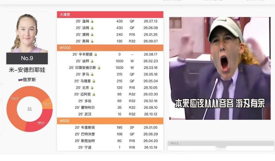小米辣当下的窘境,用时下最流行的那首歌,真的太应景不过了:“本来应该从从容容、游刃有余,现在是匆匆忙忙、连滚带爬,坐替补席”! 小米辣落得最后时刻被莱巴金娜弯道超车,要我说,她自己下半赛季多次自爆固然有不可推卸的责任,可教练团队最后时刻的盲目自信才是导致她无缘年终总决赛的罪魁祸首。怎么能不报名东京站的比赛呢?怎么能签证来不及呢?再说了,看到无数次的小米辣在球场上发癫,教练团队也没有进行很好的心理建设和干预啊,就任由她在场上一次又一次发癫!马丁内斯真的枉为金牌教头啊!