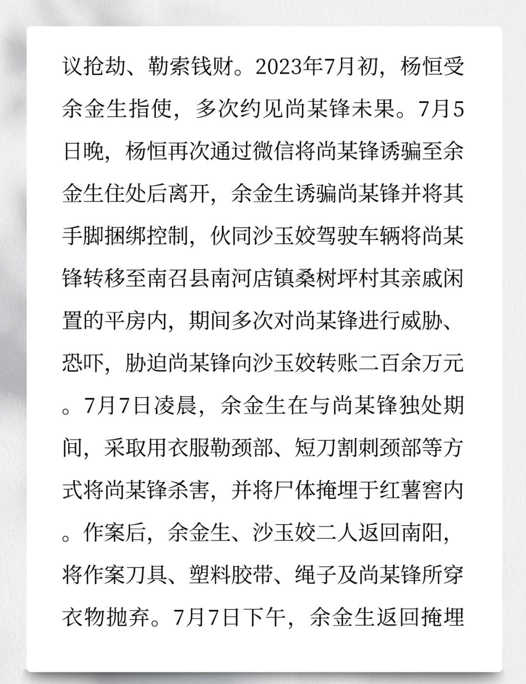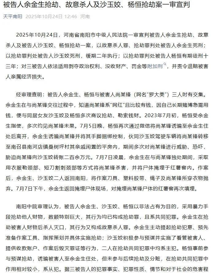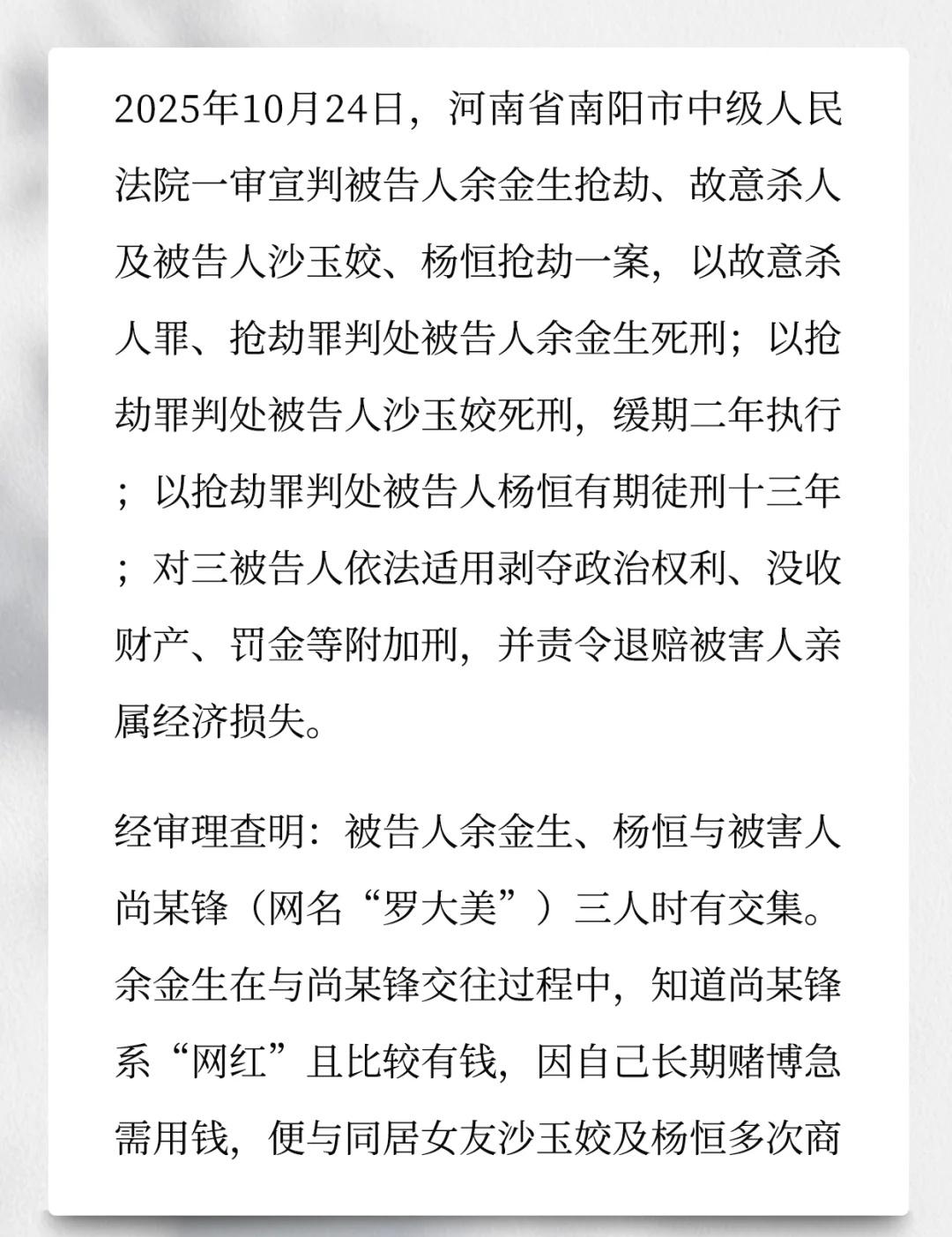 百万粉网红罗大美遇害案,判决来了…… 2025年10月24日,河南省南阳市中级人民法院一审宣判:被告人余金生以故意杀人罪、抢劫罪判处死刑;被告人沙玉姣以抢劫罪判处死刑,缓期二年执行;被告人杨恒以抢劫罪判处有期徒刑十三年;对三被告人依法适用剥夺政治权利、没收财产、罚金等附加刑,并责令退赔被害人亲属经济损失。 想要了解案件详情,可以查看往期笔记。 真实案件 正义永远不会缺席 罗大美