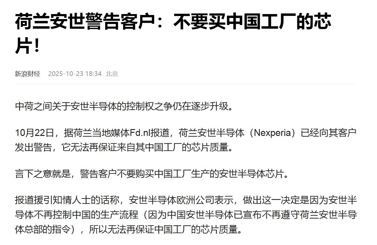 荷兰安世警告全球客户:“不要买中国工厂生产的芯片”。 据荷兰媒体透露,荷兰安世半导体总部向全球客户发出警告:“荷兰总部已与安世中国区划清界限,总部已不再掌控中国工厂生产,无法保证芯片质量。” 很明显,荷兰这是告诉所有客户“不要购买安世中国区产的芯片”,而所谓的不在掌控中国工厂生产流程,不过是它们“耍无赖”的一种手段,有意思的是,就在前几天,荷兰经济大臣还主动与中方通电话,希望就安世半导体目前的问题进行磋商,甚至还表明荷兰有很足的诚意。 一边跟我们释放积极谈判的态度,一边诋毁我们的产品质量,这哪是有诚意,这就是想拖延时间,拖到中美新一轮贸易谈判结束,如果美方妥协,荷兰肯定也会及时的归还安世半导体控制权,如果美方继续与中国搞贸易战,放心,荷兰肯定紧跟美国脚步,继续冻结安世半导体公司,甚至还会及时组建新的工厂,以打压中国安世工厂的市场份额,荷兰在古罗马时代就是靠“海盗”起家,现在还想靠“强盗”的方式积累财富,已经完全不可能了。 如果不出意外,等中美贸易谈判结束,不管结果如何,荷兰还不释放安世半导体,中方就会拿出多种反制政策,反正荷兰在中国的企业有10多家,还都是一些资产高达百亿的大公司,真搞对等制裁,我们还真不一定输。