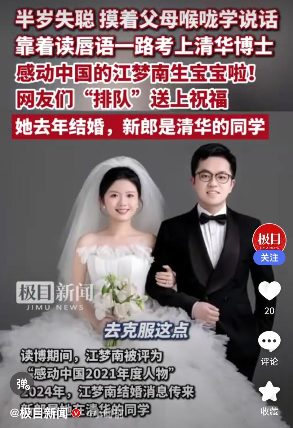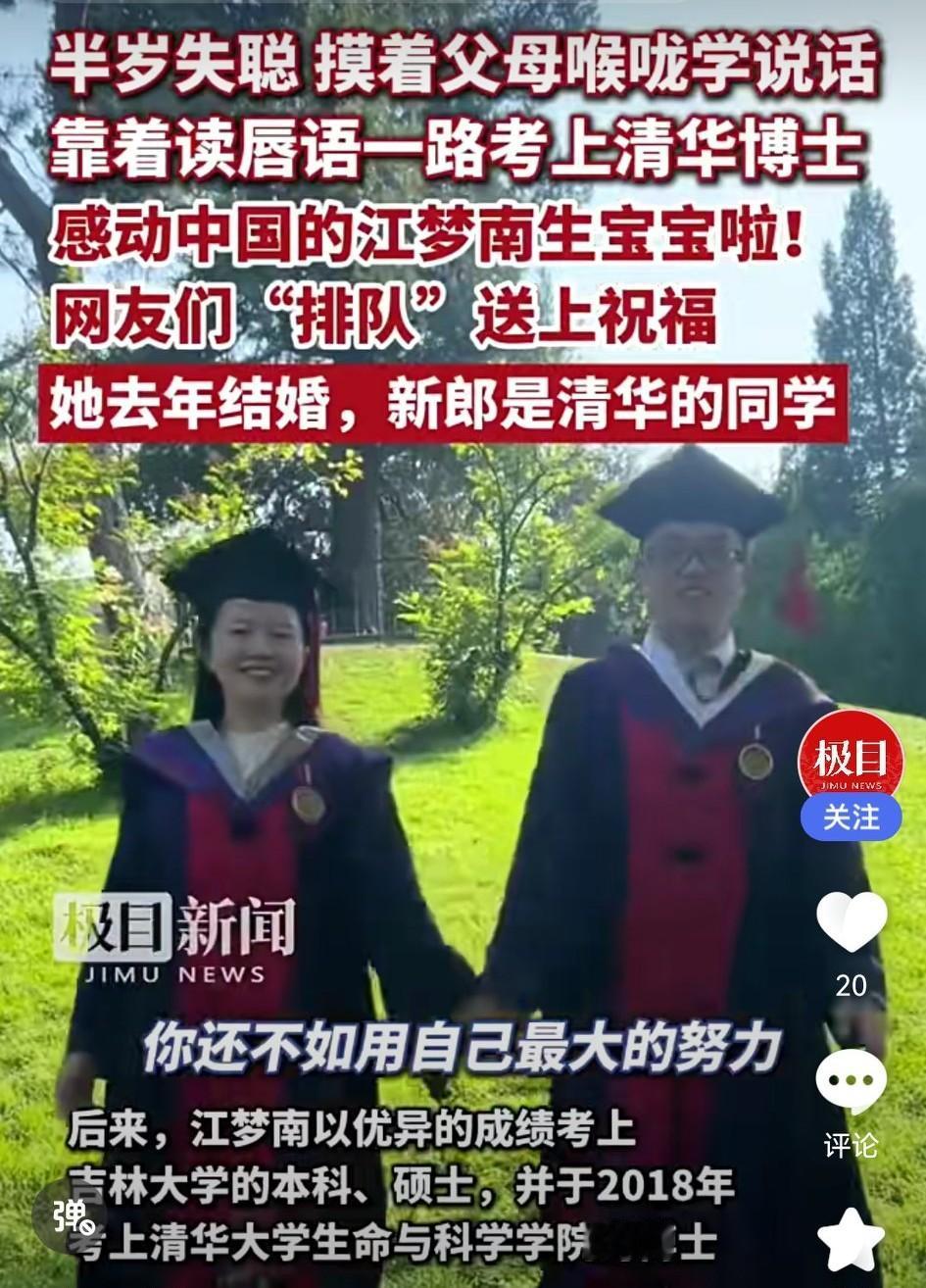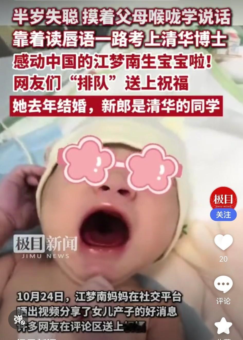 2021年感动中国的江梦南生宝宝啦!消息一出来,网友们纷纷送上祝福。江梦南半岁时因药物致极重度神经性耳聋,左耳听力损失超105分贝,右耳全失聪。但她靠着摸着父母喉咙学说话、读唇语,一路考上清华博士,用韧劲书写生命奇迹。当初医生建议送她去聋哑学校学手语,可她父母偏要教她说话。江梦南也不负期望,在无声世界里绽放光芒。 有人说:当年高中作文素材,现在就记得三个,江梦南,张桂梅,黄文秀。她是西湖大学博士后,这样还能读到这个学历,是顶级智力了。 如今她成为妈妈,开启生命新篇章,这不仅是她个人的幸福,也给无数人传递着爱与希望,真的太让人敬佩了!相信她能把这份坚强与爱传递给宝宝,继续书写新的精彩。