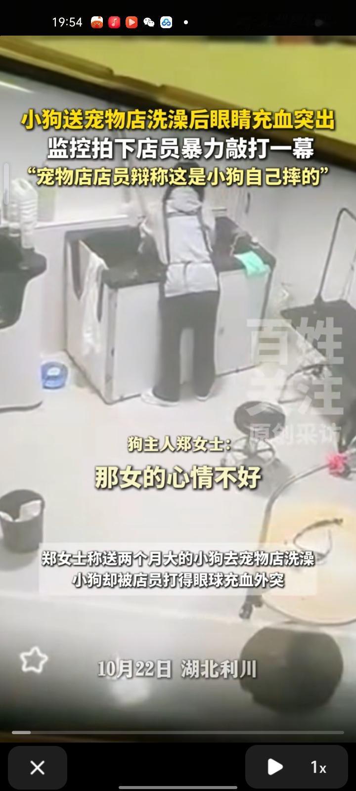 10月22日,恩施州利川市。郑女士将自己两个月大的小狗送去宠物店洗澡,接回后发现小狗眼球充血外突。宠物店店员起初辩称是小狗自己摔的,郑女士调取监控后,对方才承认打了狗。 郑女士介绍称,店员是因为心情不好,用鞋刷子打了狗狗脑袋。郑女士还表示,去找宠物店询问时他们一开始不承认打狗,看了监控才承认,并且店家态度嚣张,称 “狗眼瞎了赔钱就是了”。 宠物店老板回应称,因为狗子咬她,可能是因为这一点她就有点生气就打了那个狗子。当天直接给她解雇了,确实是没有监管到位。 这种拿生命撒气、毫无爱心的行为,根本不配从事和宠物相关的工作,更别说经营一家宠物店了。 宠物主人把毛孩子送去店里,是出于信任,觉得能得到专业照顾。但涉事店员不仅没尽到责任,还因为自己的情绪伤害弱小生命,事后又撒谎推诿,这种行为既违背职业操守,也缺乏基本的同理心。给宠物洗澡没必要去宠物店洗,买一个烘干箱,自己在家洗就是。