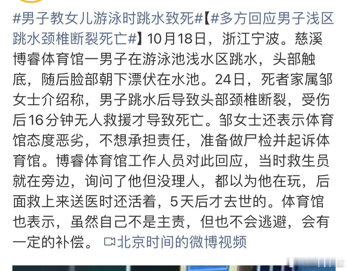 男子教女儿游泳时跳水致死浅水区也敢跳,而且和体育馆有什么关系,体育馆里面能这样跳