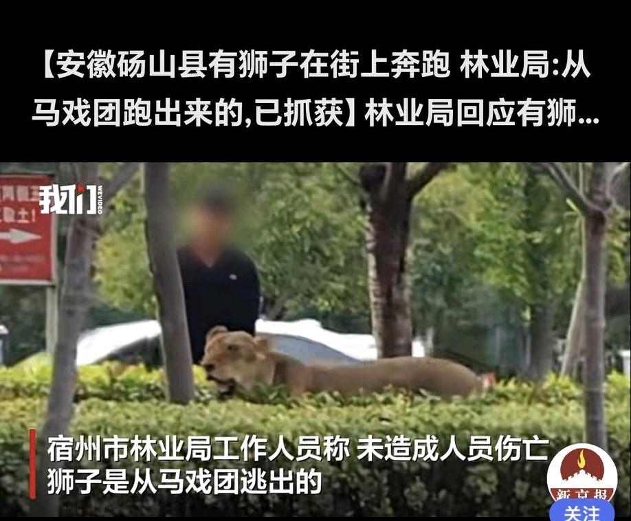 10月24日,安徽砀山县一头狮子在砀郡路街头狂奔。从网友发的视频能看到,几名男子手持铁锹追着狮子,还把它围困在道路中央的绿化带,还有人抬来装狮子的笼子。狮子是宇恒马戏团的,当时在亚琦砀山贸易广场筹备演出,喂食时意外跑了出来。11点23分,工作人员就把狮子诱捕入笼了,没伤到人。目前马戏团被责令停止演出整顿。之后狮子会被送往宿州野生动物园。 A网友:怕啥?饿了它就自己回家了,让它体会到了家的温暖,以后就不会再离家出走了。 B网友:明明是头狮子,却被困在笼里当牛马。实践证明,马戏团逃出来的狮子,就不是狮子了。 C网友:比昨天东北养殖场跑出来那个黑熊幸运。真有胆儿,还逮住了,如果兽性大发不是你追它,而是它追你。跑了应该及时报警用麻醉枪。 应该严禁私人和马戏团养危险性很大的动物!马戏团有老虎、狮子的,不能马虎大意!跑了太危险!这事儿真是有惊无险,也给马戏团提了个醒,可得把动物看严实了!