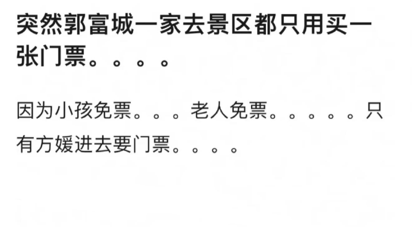 说郭富城全家去景区只用买一张门票,因为老人免票小孩免票,只有方媛一个人要买门票啊啊啊啊啊啊