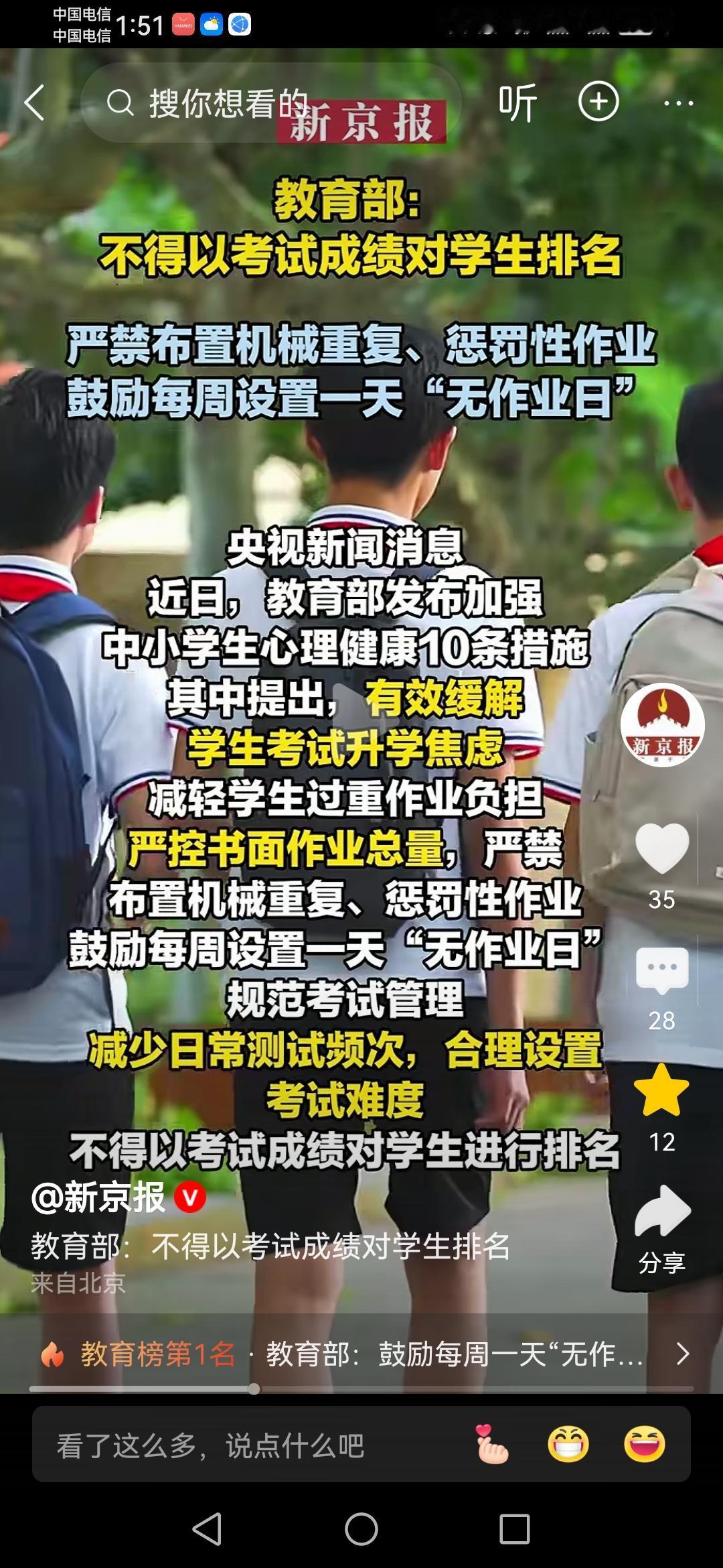 为了解决中小学生的心理健康问题, 教育部门真的不得不出手了, 整整10条措施,确实非常的给力。 但具体的作用如何,能不能根本解决问题,谁也不知道。 有人说,解决中小学的心理问题,必须要从根源上来解决,方式方法可以有很多,但解决造成这些孩子们的心理问题真实的原因要找到,才能从根源上解决问题。 从小学开始,就有不能让自己的孩子输在起跑线线上。 从初中开始,就有不好好努力,就要面对中职分流的问题,甚至连高中都上不了,或者上不了好的高中。 从高中开始,就有面对上的本科还是大专的问题,高考这道坎,让大家从高一就开始一直在卷,卷成绩,卷排名,等等等。 还有学校,老师,家长,对于孩子一切向“分数看”,让所有的孩子都感受到了巨大的压力! 或许从根源上解决问题才是最关键的吧!