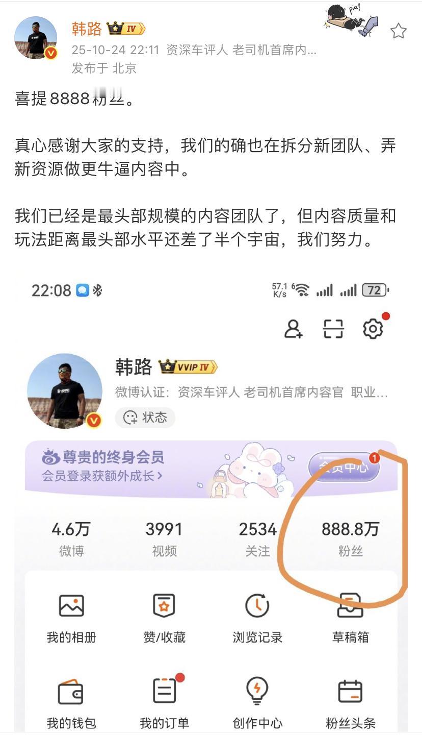 韩路:喜提8888粉丝。 真心感谢大家的支持,我们的确也在拆分新团队、弄新资源做