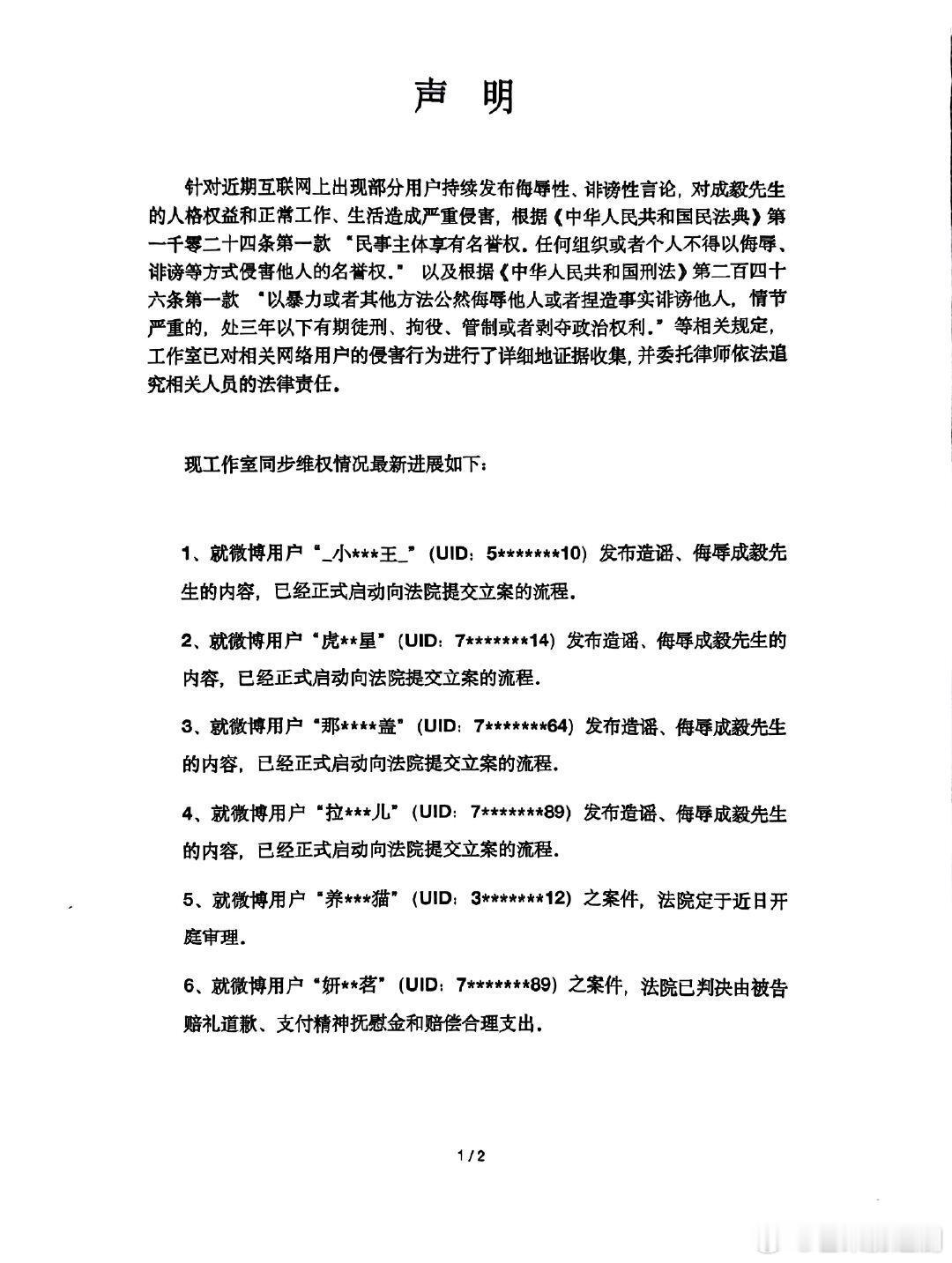 成毅工作室终于告黑了!已判决、已立案、即将开庭全都有,没上名单的不要焦急,gzs还在持续取证中。我发现有些人已经弱汁到字一多就看不明白的程度了,现在还在嘴硬。网络不是法外之地,发言需谨言慎行。
