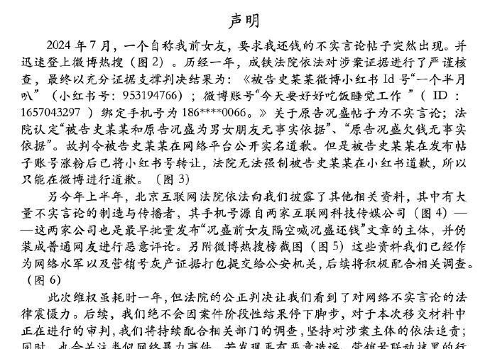 况盛公布维权结果 10月24日,@况盛-Aman 在社交平台发布一则声明,称:2024年7月,一个自称我前女友,要求我还钱的不实言论帖子突然出现。并迅速登上微博热搜。历经一年,成铁法院依法对涉案证据进行了严谨核查,最终以充分证据支撑判决结果为:被告关于原告况盛帖子为不实言论;法院认定“被告史某某和原告况盛为男女朋友无事实依据”、“原告况盛欠钱无事实依据”。故判令被告史某某在网络平台公开实名道歉。@白鹿视频
