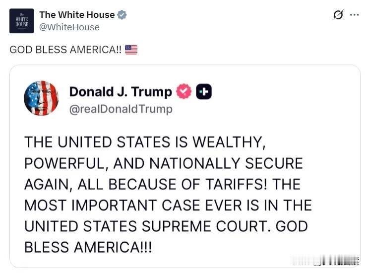 美国白宫发了一个特朗普的帖子:GOD BLESS AMERICA!(上帝保佑美国